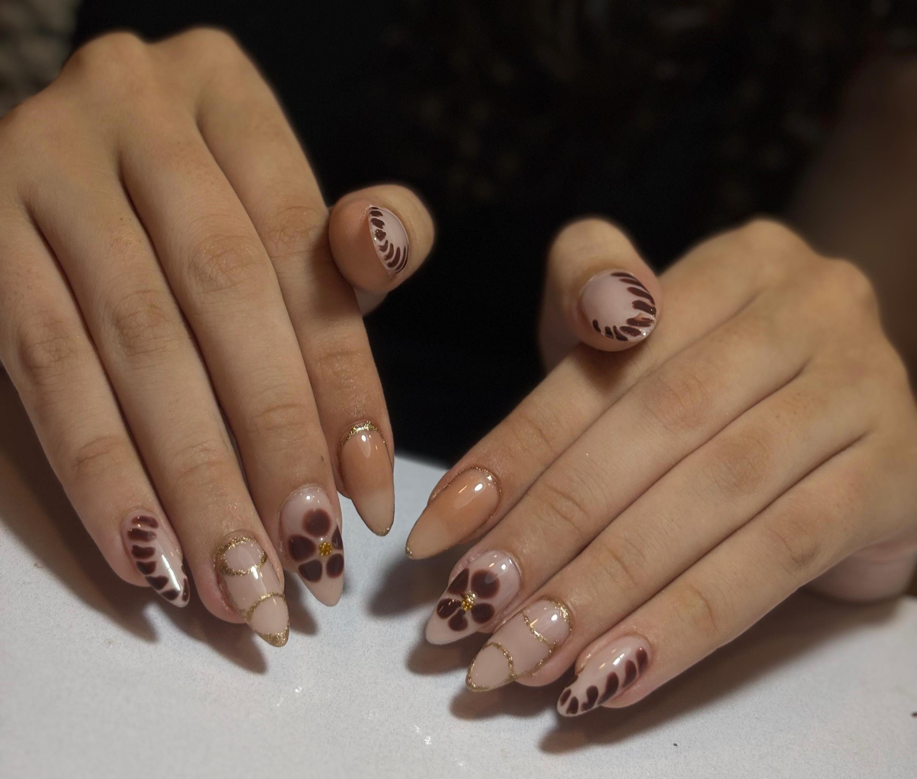10Pcs Handmade Almond-Shaped Fake Nails With brown design & flower, Fashionable And Upscale Press On Nails Nail Supplies Nails