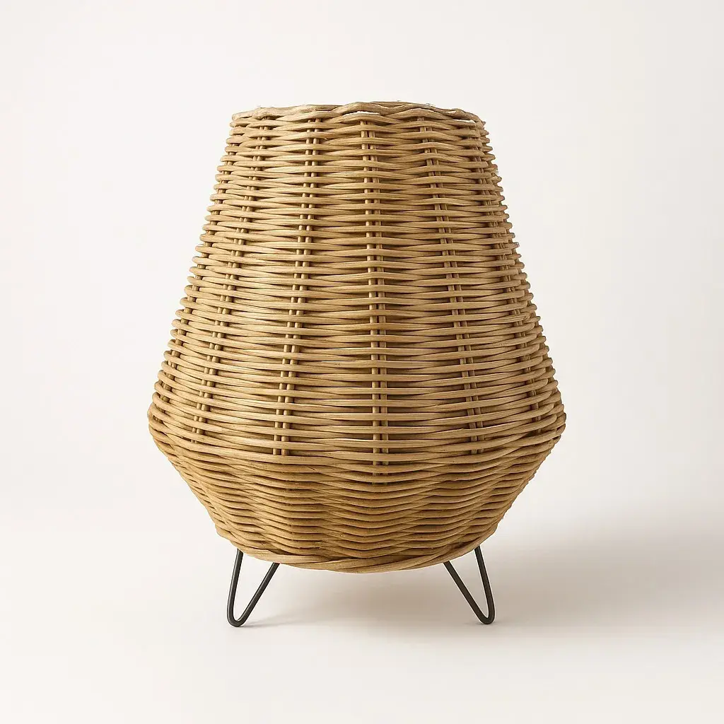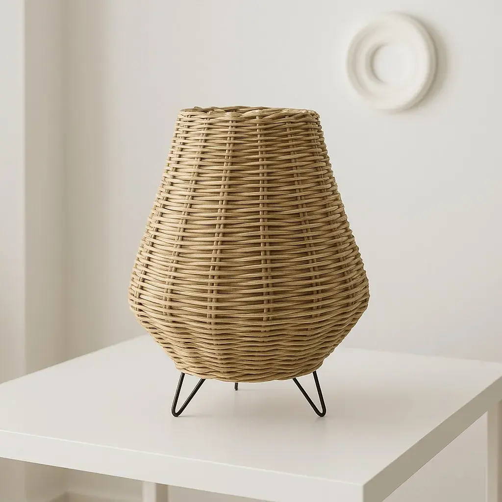 Elegant table lamp with a modern design. Features a round wooden base and a natural rattan oval shade. Adds a touch of sophistication and functionality to any space.