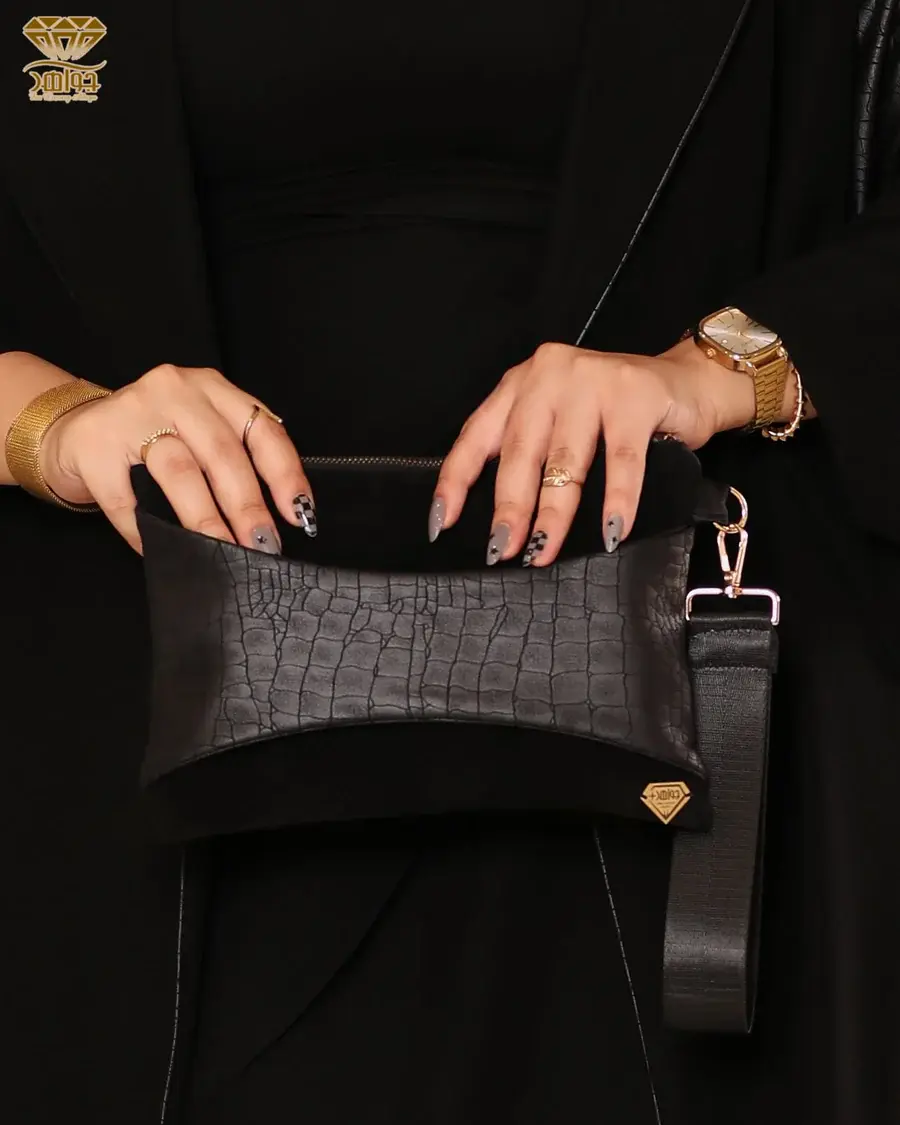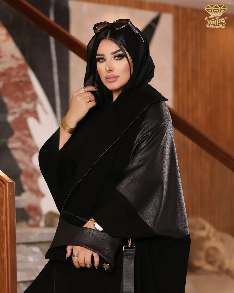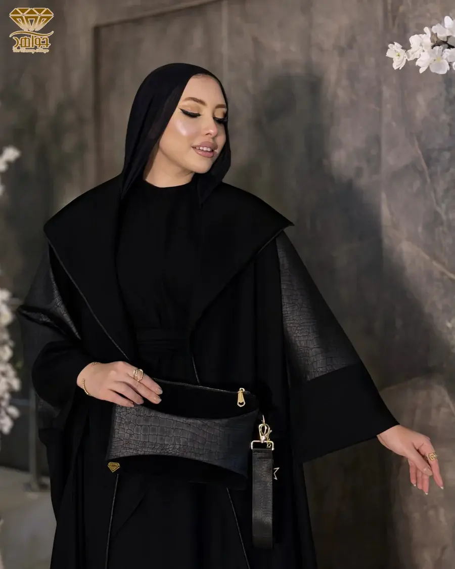 عباية أنيقة بتصميم فاخر مصنوعة من خامة برلين مستورد مع إضافة خامة بالخلف بنقشة الـ Croc-embossed والتي تتميز بنعومتها ولمعانها المميز وهي خامة تشبه الجلد من حيث الشكل فقط ولكن تأتي بملمس نسيجي ناعم.