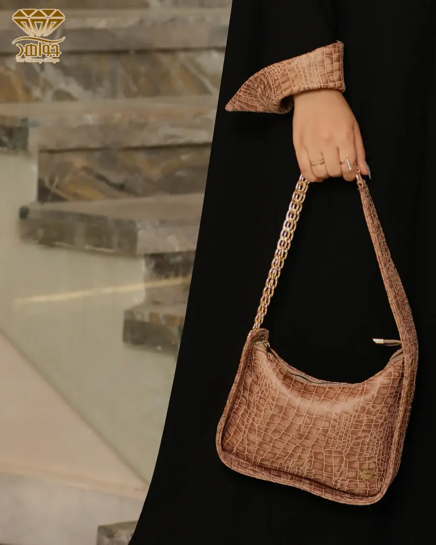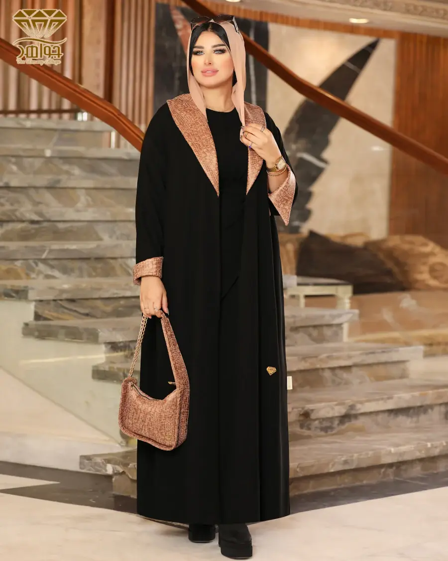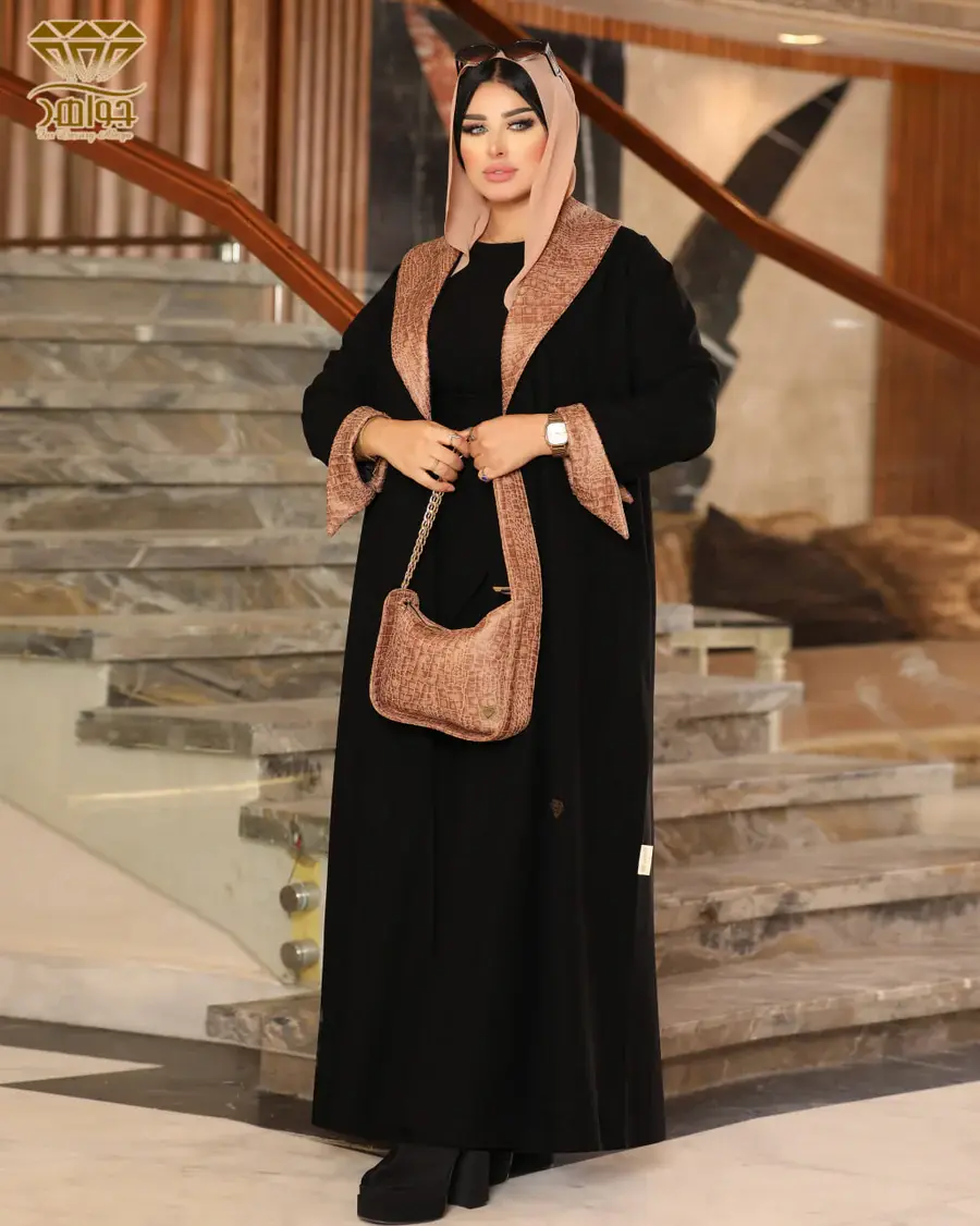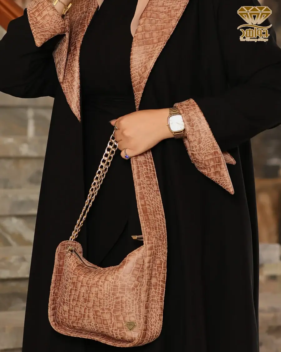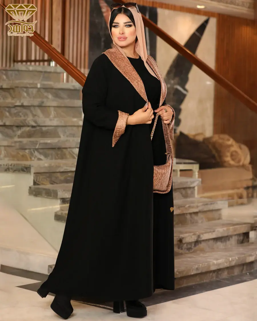 عباية أنيقة بتصميم Coat فاخر عصري مصنوعة من خامة برلين مستورد بإضافة بطانة داخلية ناعمة بالكامل للعباية، ومزودة بياقة وأكمام بنقشة Croc-embossed بملمس ناعم وفخم وهي خامة تشبه الجلد في الشكل فقط وليس الملمس.