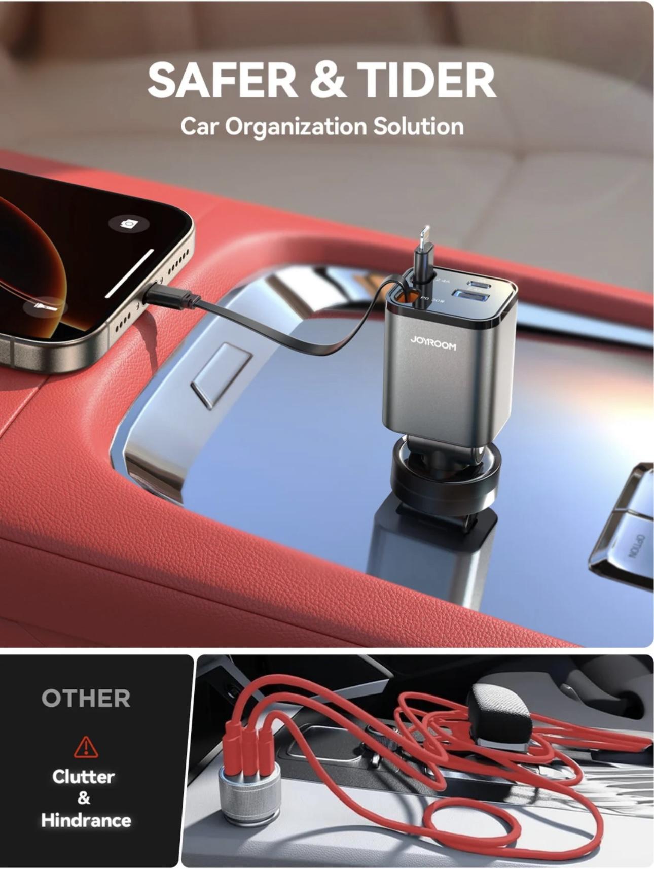 • 65W 4-in-1 Retractable Car Charger delivers QC/PD fast charging via 4 ports (USB-C/USB)