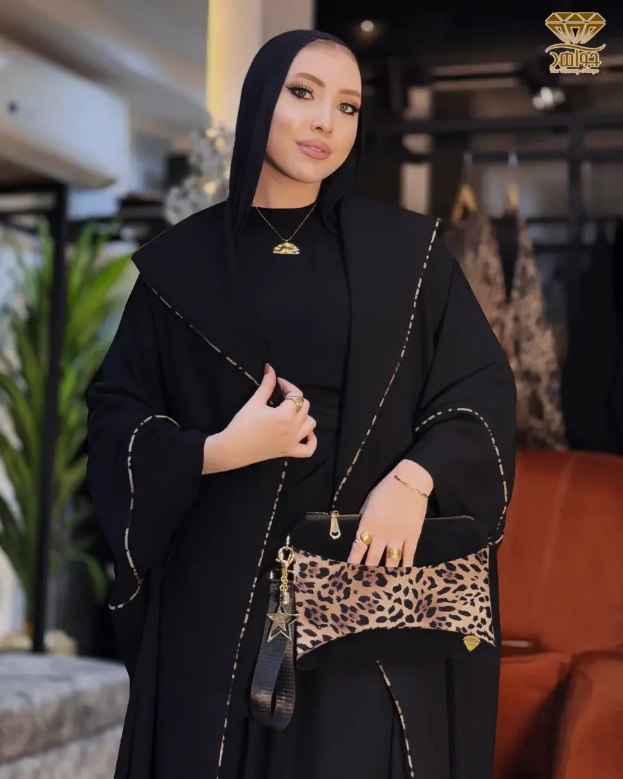 عباية بتصميم أنيق وفخم مصنوعة من خامة برلين مستورد بإضافة بيه جانبي وخلفي بلمسة من Leopard Print بملمس مخملي ناعم وفخم.