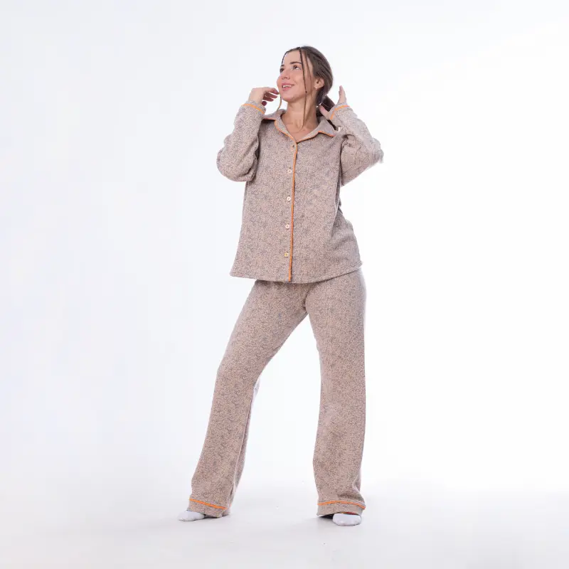 Enjoy the beauty of winter in our Melton Jacquard Winter Pajama, crafted from high-quality Melton jacquard fabric known for its warmth and elegant patterns. This cozy set includes a soft blouse and matching pants, both featuring intricate jacquard designs that add a touch of sophistication. Perfect for cold-weather lounging or home gatherings, these pajamas combine comfort, durability, and refined style in one luxurious winter essential.