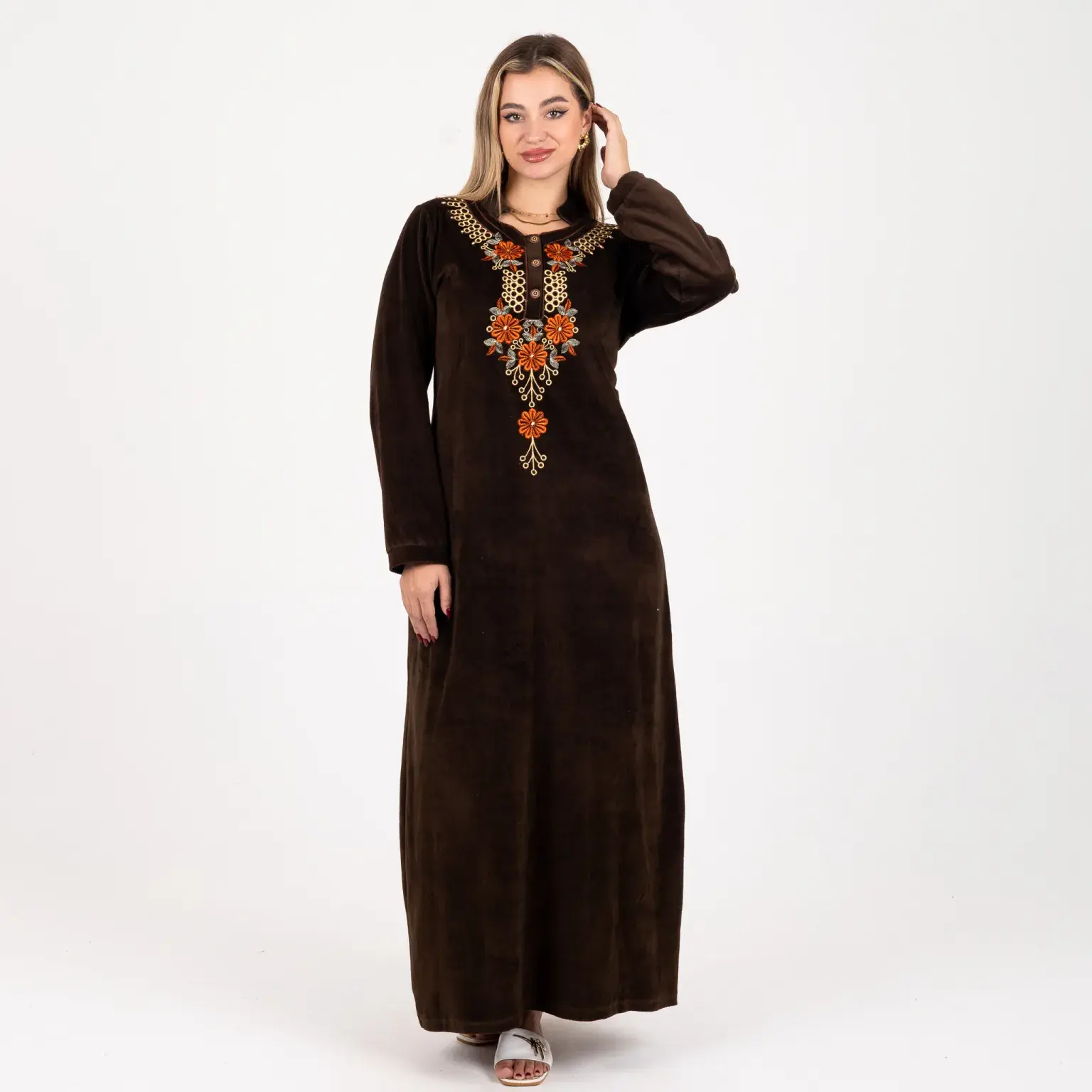 عباية مقفولة بخامة برلين مستورد مع أكمام بخامة چاكار مستورد، بإضافة تطريز ديجيتال بأجود أنواع الخيوط المستوردة.
