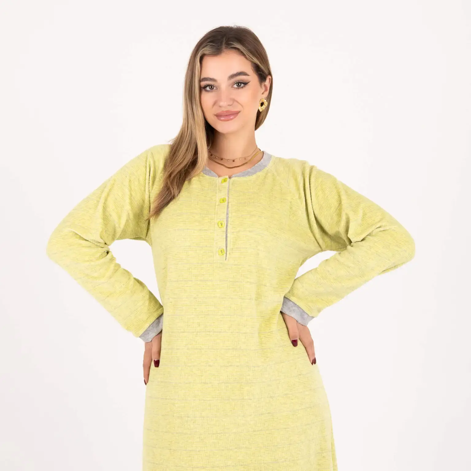 • 🎀 Button-up neckline and contrasting sleeve cuffs
