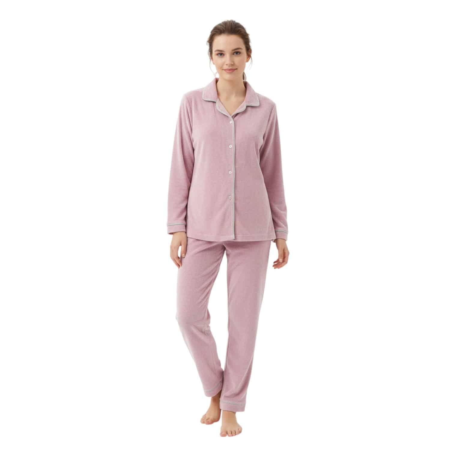 Relax in effortless comfort with this elegant women’s pajama set, designed for cozy nights and stylish lounging. Featuring a classic button-down top with a relaxed collar and matching full-length pants, this set combines timeless design with everyday practicality. The soft, breathable fabric feels gentle on the skin, making it ideal for sleeping, relaxing at home, or casual indoor wear.