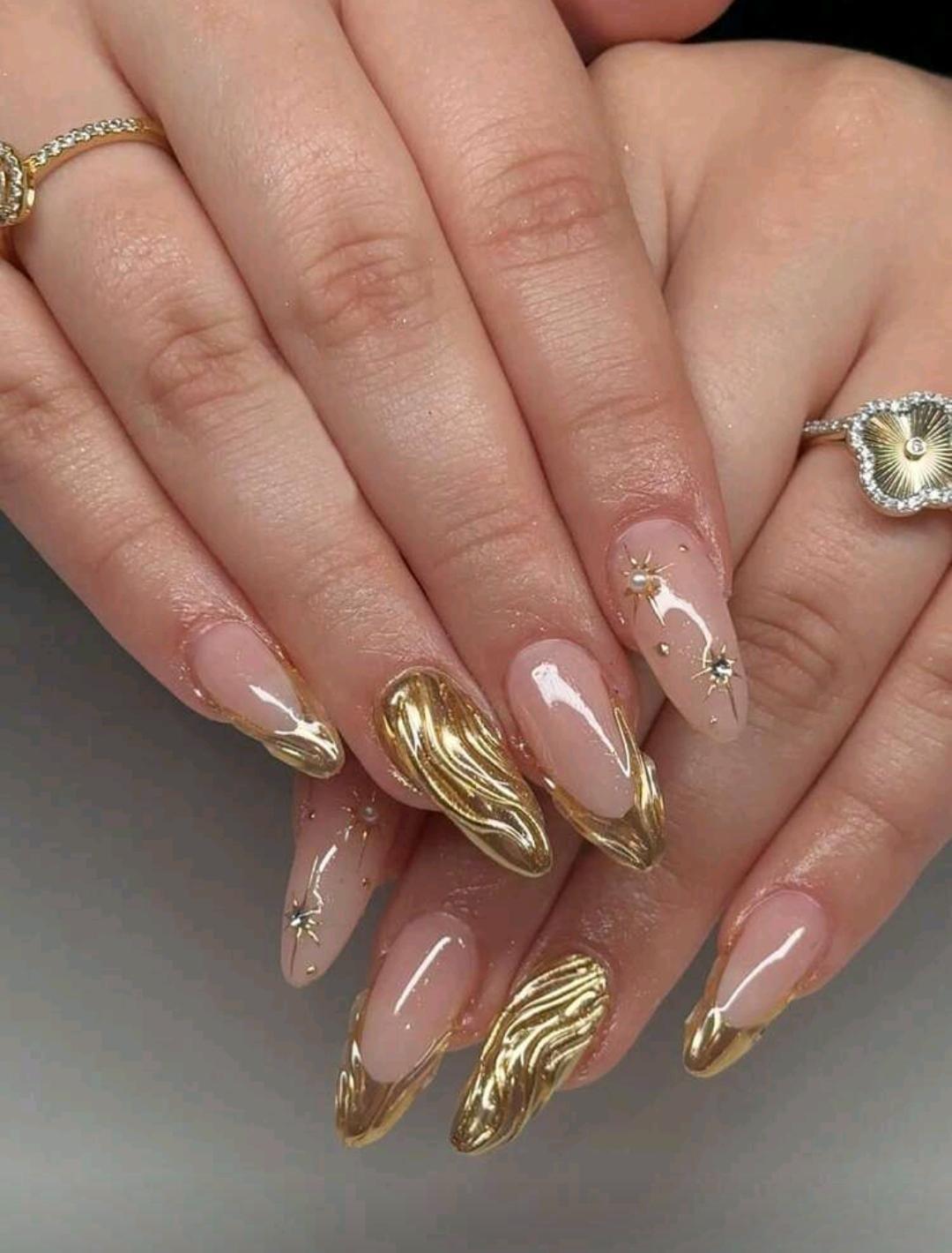 10pcs Handmade press on nails Long Almond Gold 3D Gel Nail Stickers To Enhance Your Fashion Style! This French Almond Nail Sticker Set Features Star Rhinestones, Perfectly Fits Your Nail Shape, And Is Made Of Acrylic Material. The Set Includes: 1 Piece Of Jelly Gel And 1 Nail File. The French Almond Nail Stickers Are Suitable For Women And Girls For Daily Work, Festivals, Parties, And Various Occasions.