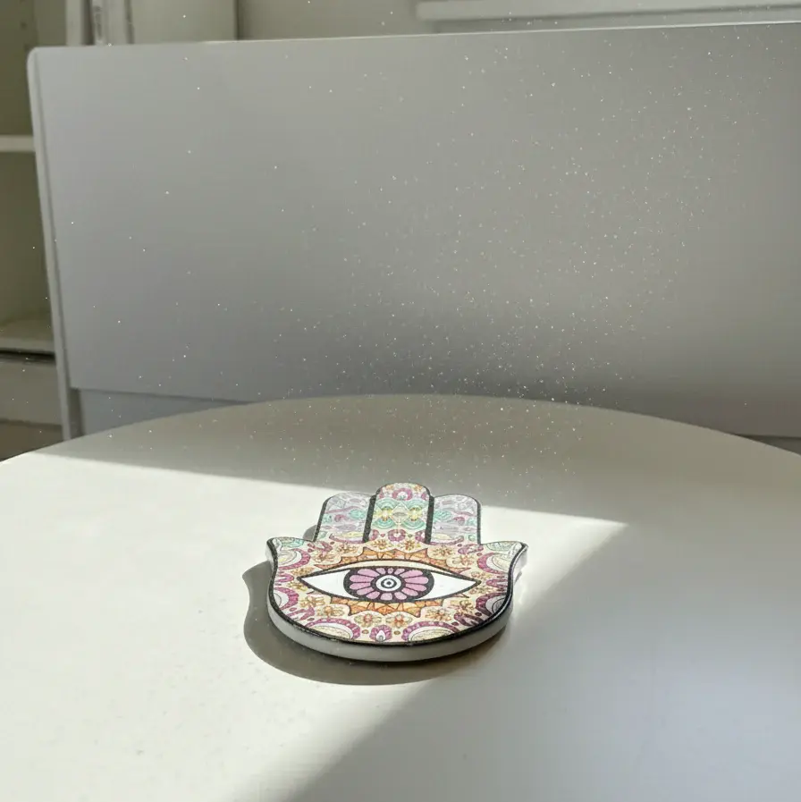 A vibrant and spiritual accent piece designed to protect your surfaces while elevating your décor. The Mystic Hamsa Coaster features the iconic Hand of Fatima motif, infused with detailed floral and geometric patterns in rich, colorful tones.