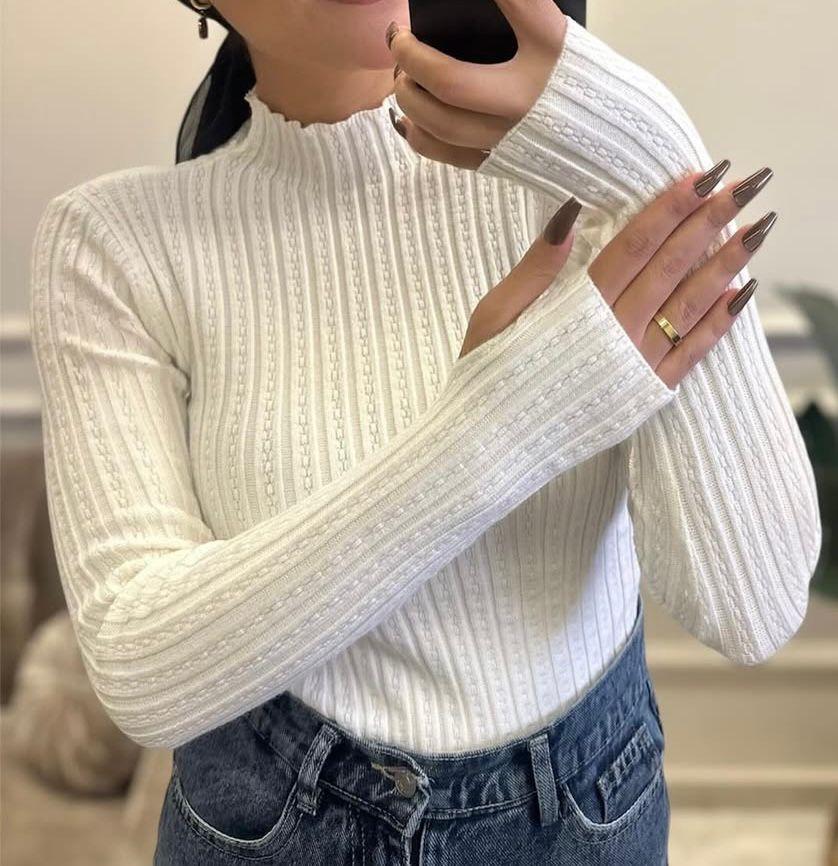 بيزك توب مضلّع بخامة ناعمة ومرنة، قصة سليم فيت مع ياقة عالية، مريح وعملي ومناسب للتنسيق اليومي.