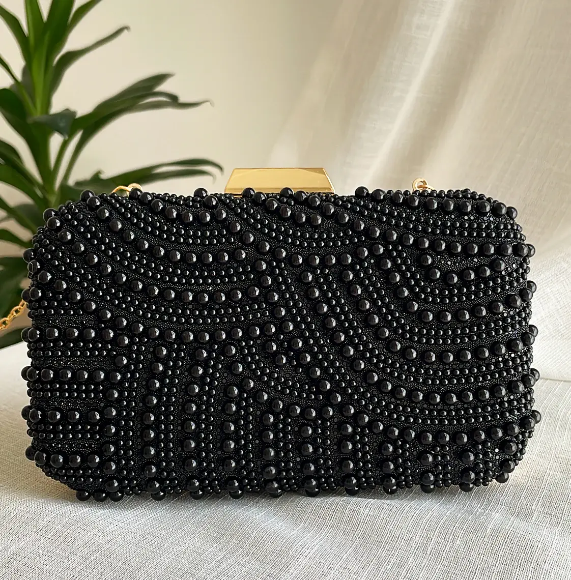 Experience luxury and sophistication with our black Mother Of Pearls Clutch. This chic and classy night clutch is made with the highest quality pearls, adding an elegant touch to any outfit. Perfect for formal events and sure to make a statement, indulge in the beauty and craftsmanship of this stunning piece.
