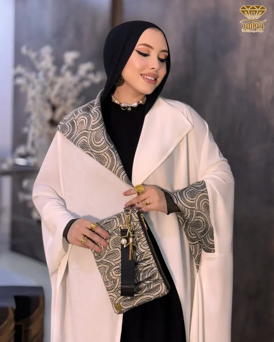 عباية بتصميم مميز بخامة برلين أبيض مستورد بإضافة كم ولياقة بخامة فخمة چاكار مستورد.