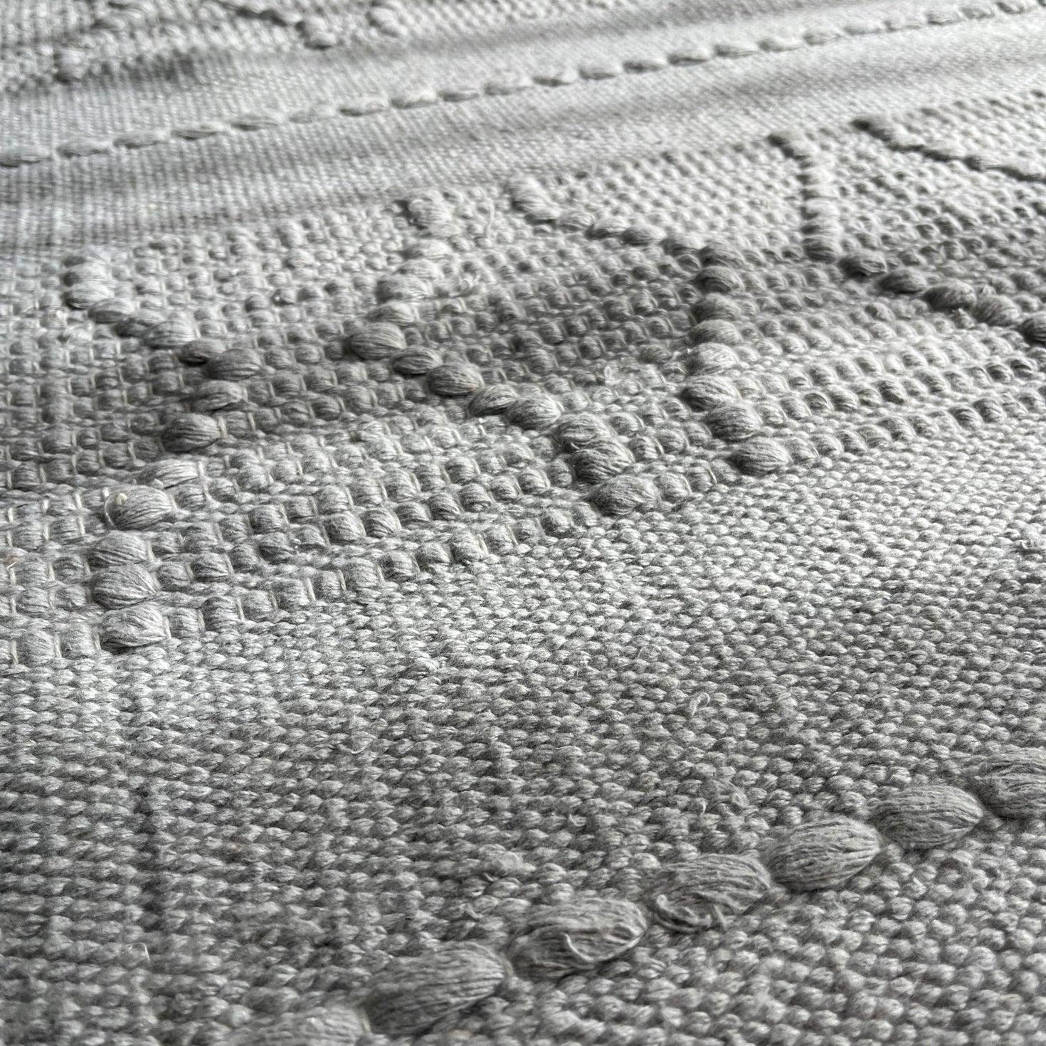 A beautifully woven soft-grey kilim featuring raised geometric detailing for subtle texture and depth. Its calm, neutral tone blends effortlessly with modern, Scandinavian, boho, and minimal interiors. Finished with hand-tied fringes for an artisanal touch.