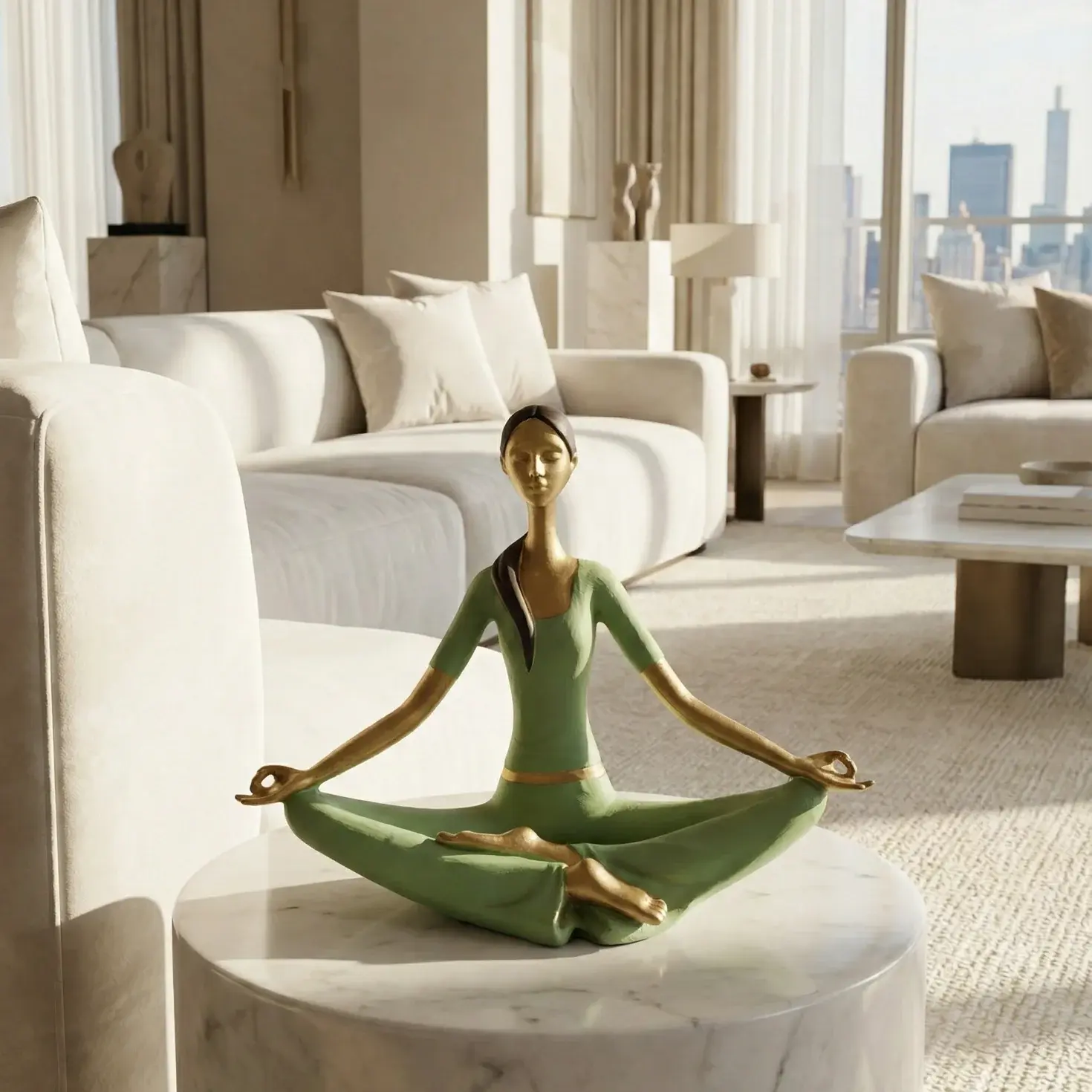 A graceful decorative figurine capturing a calm yoga pose, designed to bring balance and tranquility into your space. The soft green tones combined with gold accents create a soothing yet elegant presence that fits seamlessly into modern and mindful interiors.