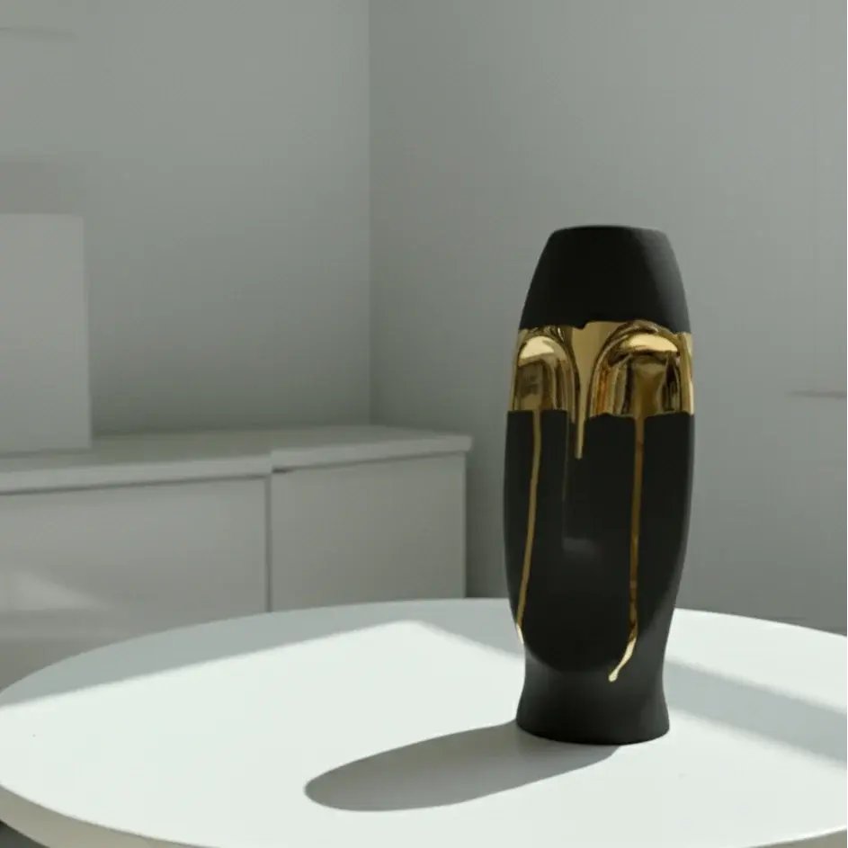 An artistic blend of minimalism and luxury, the Aureus Face Vase Duo showcases abstract human faces with smooth white surfaces and dripping metallic gold accents. The fusion of matte and reflective textures creates a captivating visual contrast, making these vases both sculptural and functional. Ideal for modern interiors seeking a refined artistic touch.