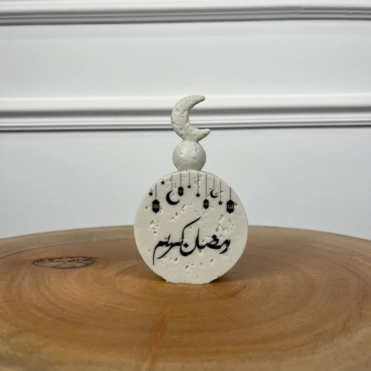 A charming handcrafted tabletop ornament featuring a round textured base topped with a crescent moon. The front is delicately illustrated with hanging lanterns, stars, and Arabic calligraphy reading “رمضان كريم”, making it a warm and festive accent for Ramadan décor. Its compact size makes it ideal for shelves, side tables, or trays.