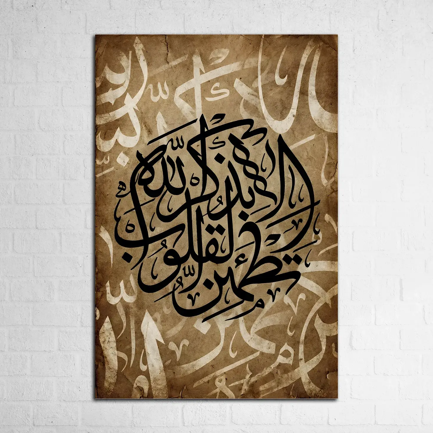 Elegant Islamic calligraphy artwork featuring the Quranic verse “ألا بذكر الله تطمئن القلوب” (“Verily, in the remembrance of Allah do hearts find rest”). Designed with a rich, vintage-inspired background and bold black calligraphy, this piece adds spiritual depth and timeless elegance to any space. Perfect for living rooms, prayer areas, offices, or as a meaningful gift.