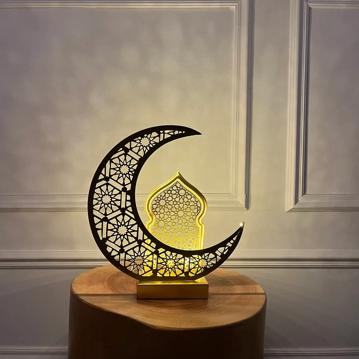 A refined decorative piece combining a crescent moon and Islamic arch silhouette, intricately cut with geometric patterns. When lit, it emits a soft, warm glow that highlights the delicate details, creating an elegant spiritual accent. Designed to stand gracefully on consoles, shelves, or side tables, it’s ideal for Ramadan décor or timeless Islamic styling.
