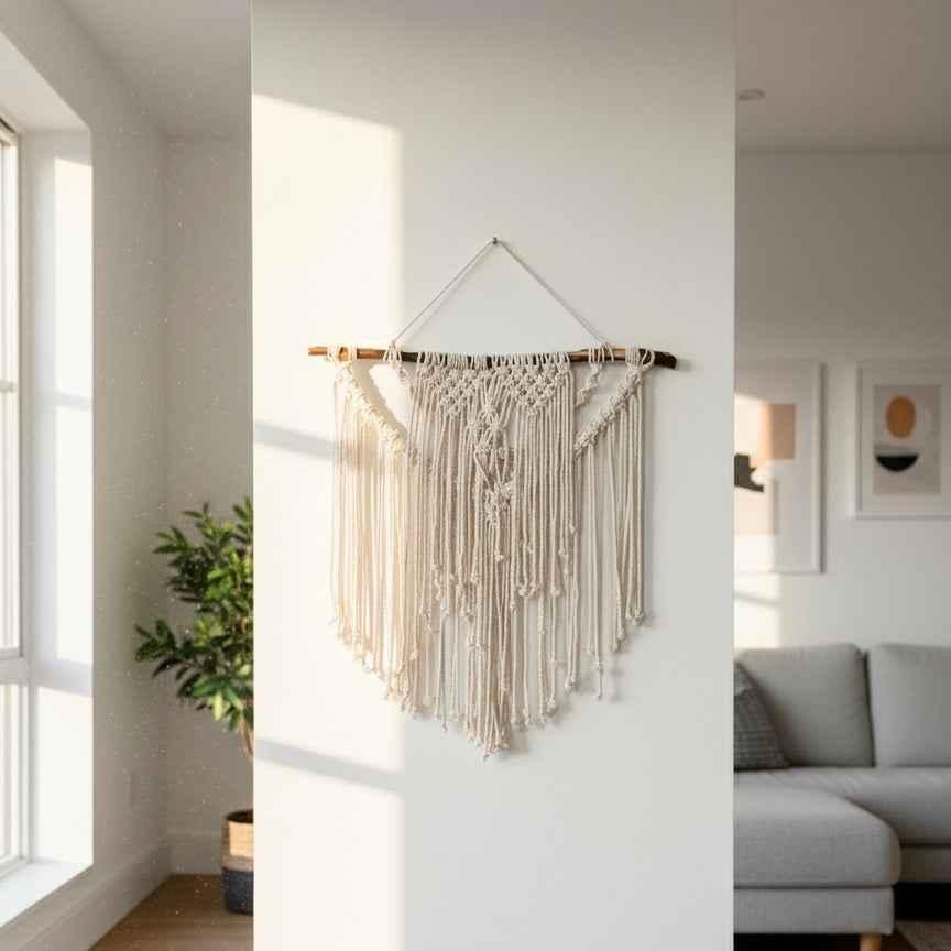 A beautifully handcrafted macramé wall décor piece made from natural cotton cords and suspended on a wooden rod. With its intricate knots and cascading fringe, it brings warmth, texture, and a relaxed bohemian charm to any modern living space.