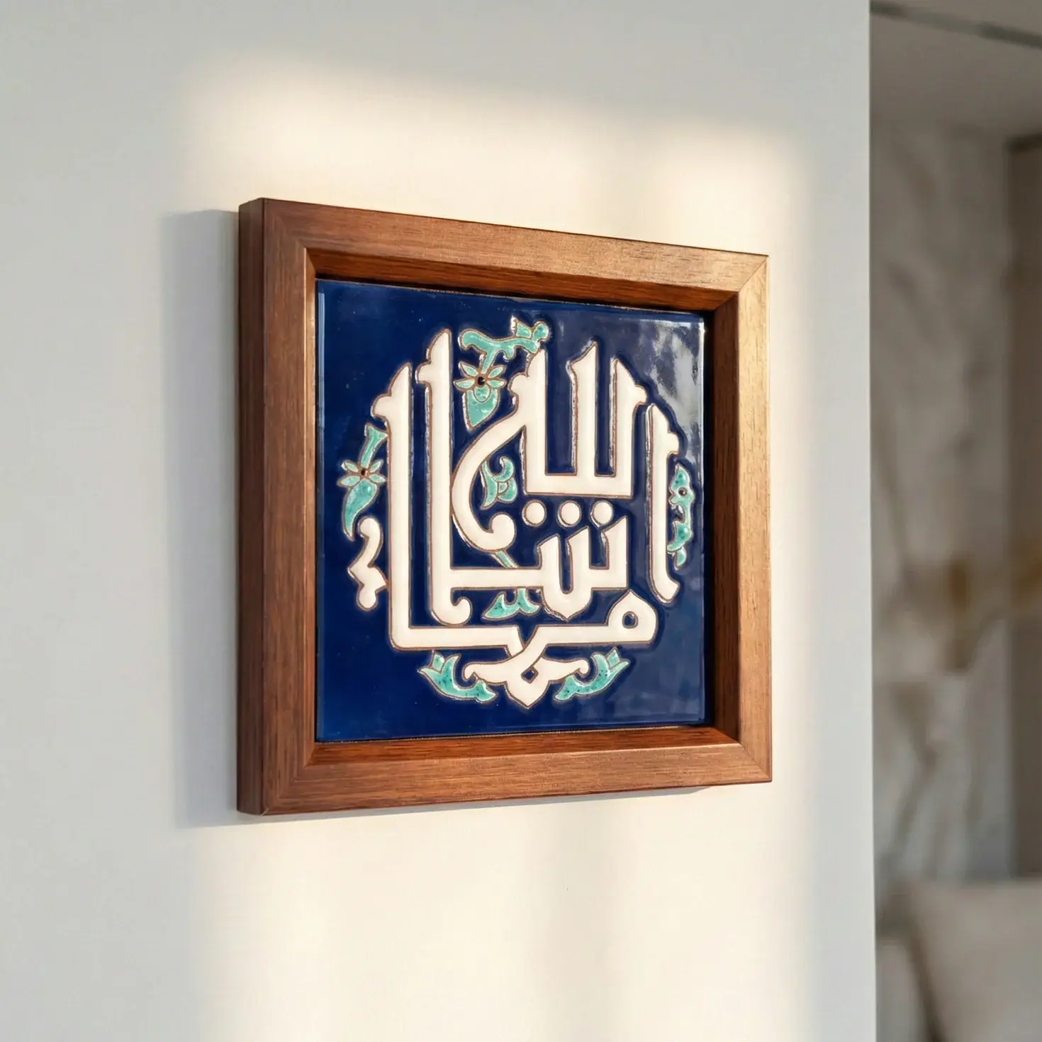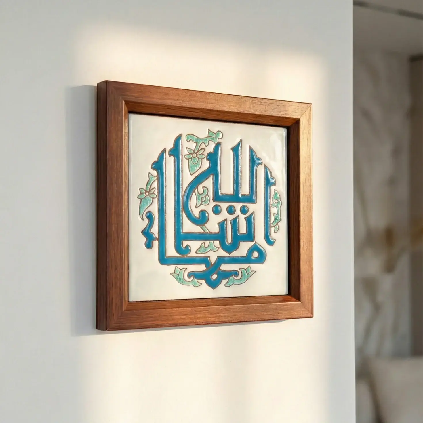 A refined decorative wall piece featuring the Arabic phrase “ما شاء الله” rendered in elegant calligraphy and set within a solid wooden frame. The hand-painted glazed ceramic artwork combines traditional Islamic expression with a clean, contemporary presentation, making it a meaningful and timeless accent for any space.