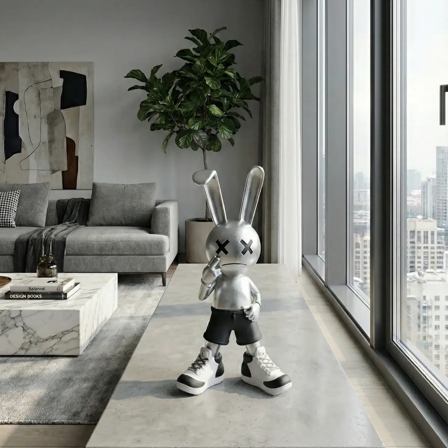 A modern decorative figure with a bold, playful attitude. The Silent Mood Bunny features a smooth matte finish, crossed-eye expression, and oversized sneakers that give it a strong street-art vibe. Designed as a statement piece, it adds character to shelves, desks, or coffee tables. Perfect for contemporary interiors and collectors who love minimal yet expressive décor.