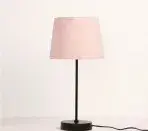 Black base with a soft pink fabric lampshade