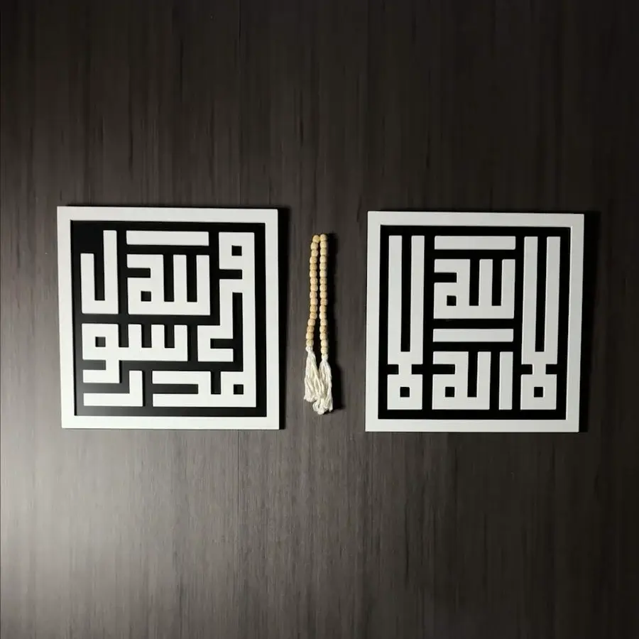 A refined two-piece Islamic wall art set featuring bold geometric Arabic calligraphy in a modern square composition. Crafted with a double-layered wood design, each piece creates depth through contrast between the raised calligraphy and the background, resulting in a striking yet minimalist aesthetic.