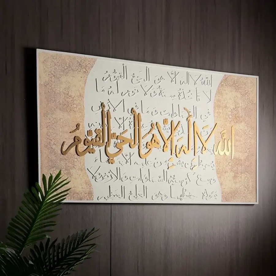 A striking large-scale Islamic wall artwork featuring Ayat Al-Kursi in elegant Arabic calligraphy, highlighted with a refined gold-tone finish over a textured neutral background. The layered script design adds depth and presence, making it a powerful spiritual centerpiece for living rooms, prayer areas, offices, or majlis spaces.