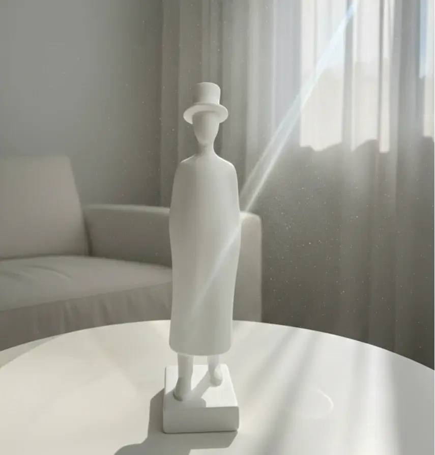 An elegant and mysterious sculpture that embodies sophistication and quiet strength. The Noir Gentleman features a faceless figure in a sleek coat and top hat, finished in deep matte black for a modern, sculptural aesthetic. A refined piece that adds depth and intrigue to any contemporary space.
