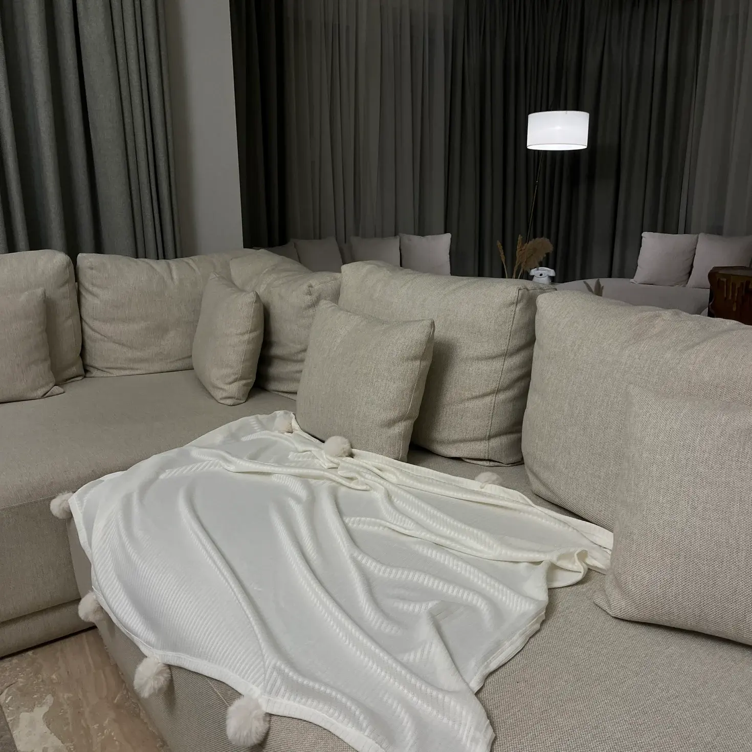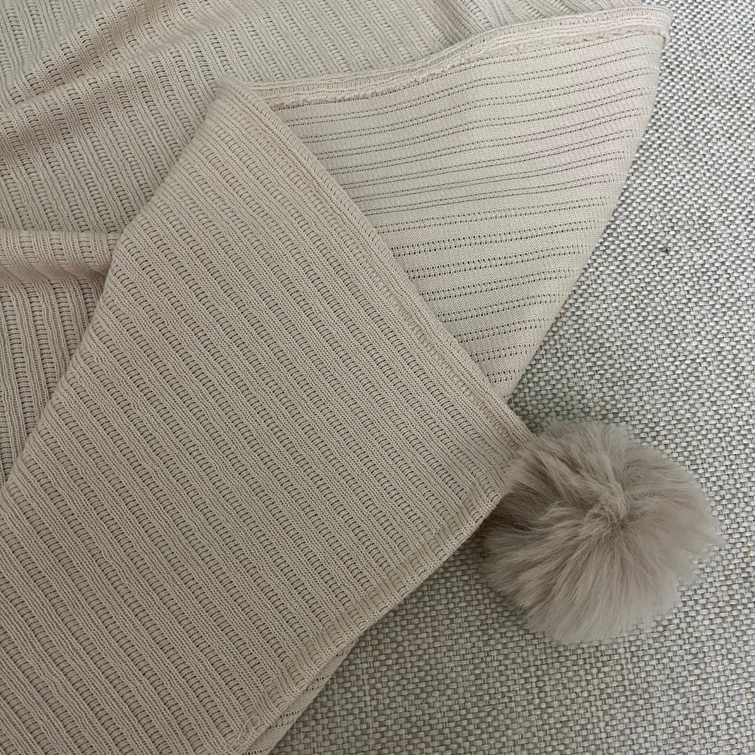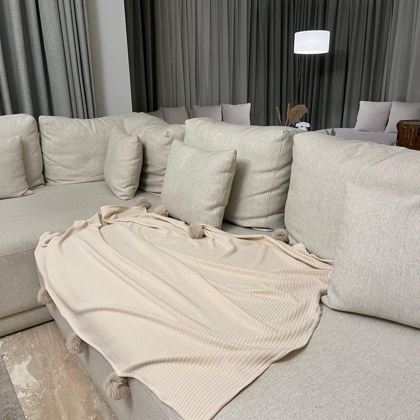 Add a soft, elegant touch to your space with this cozy ribbed throw blanket. Designed with fluffy pom-poms on all sides, it brings a warm, playful feel while blending beautifully with modern, minimal interiors. Perfect for sofas, beds, and reading corners.