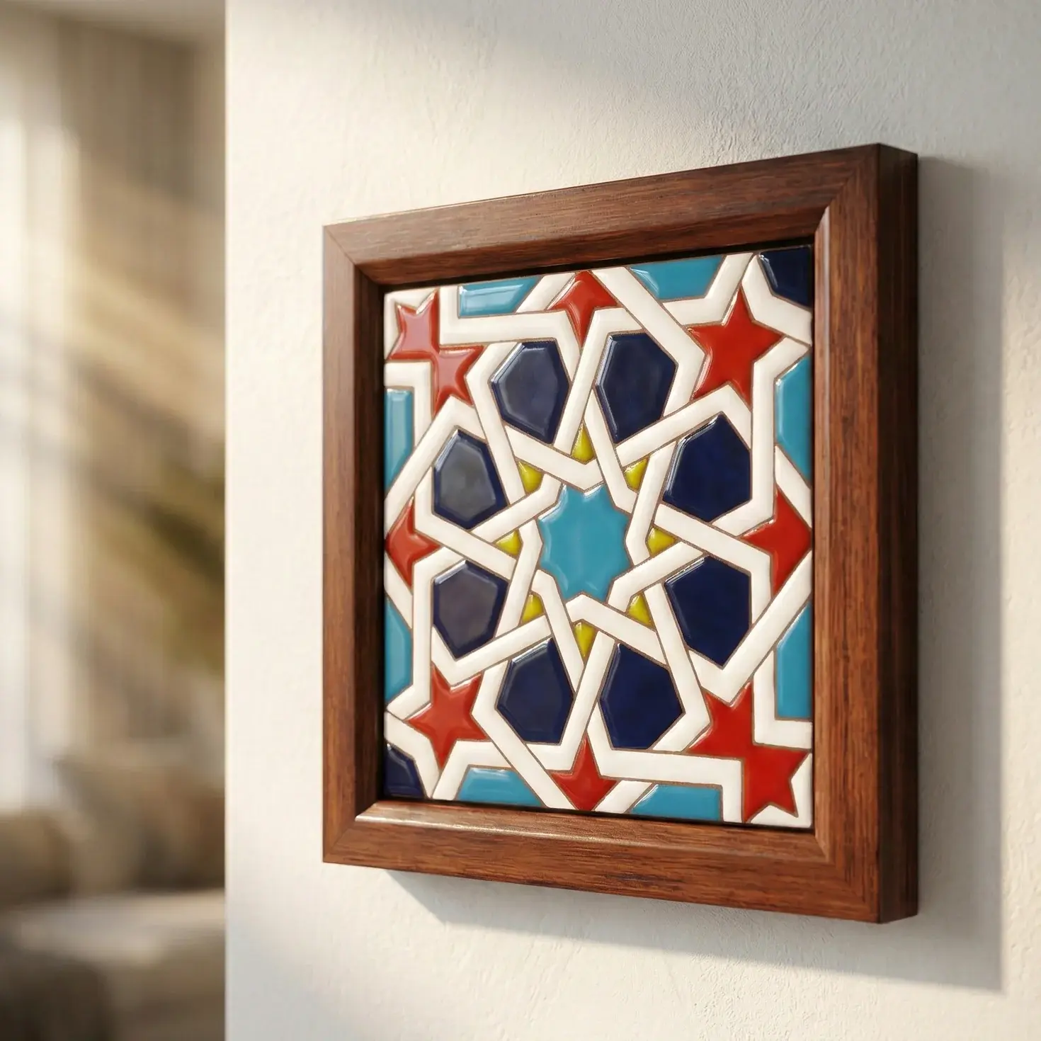 A hand-painted glazed ceramic artwork inspired by Nubian and Islamic geometric heritage, featuring an intricate interlocking star pattern in warm mustard, turquoise, and deep blue tones. Framed in natural wood, this piece reflects symmetry, craftsmanship, and the architectural language of Nubian design.