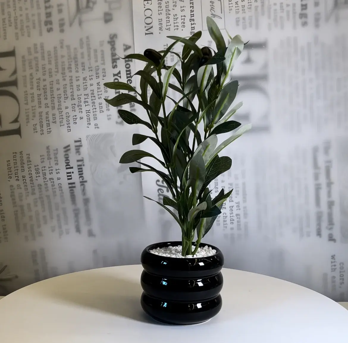 A refined decorative planter featuring a realistic artificial olive plant set in a glossy black ceramic pot with a ribbed silhouette. The contrast between the deep green foliage and the bold black base creates a modern, elegant statement that adds depth and sophistication to any interior.