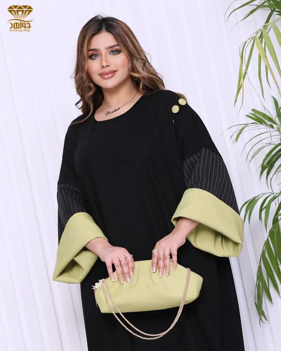 عباية مقفولة بتصميم مميز بخامة برلين مستورد، بإضافة قلبة كم بخامة چاكار مستورد وإضافة زراير بنفس الخامة للتصميم.