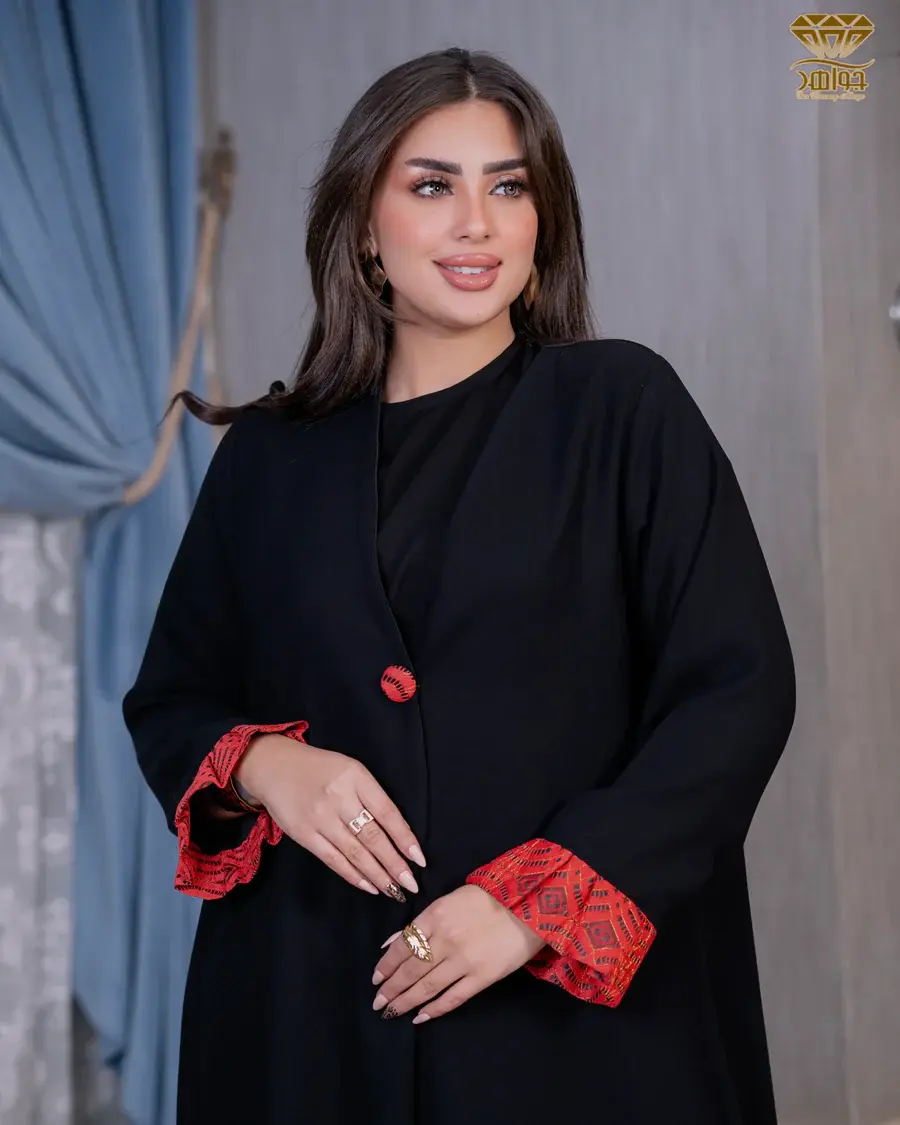 عباية بتصميم Simple مصنوعة بخامة برلين مستورد، مع إضافة كم وزرار من خامة شبك ملون، والزرار مزود بكبسونة للتحكم في فتح وغلق العباية.