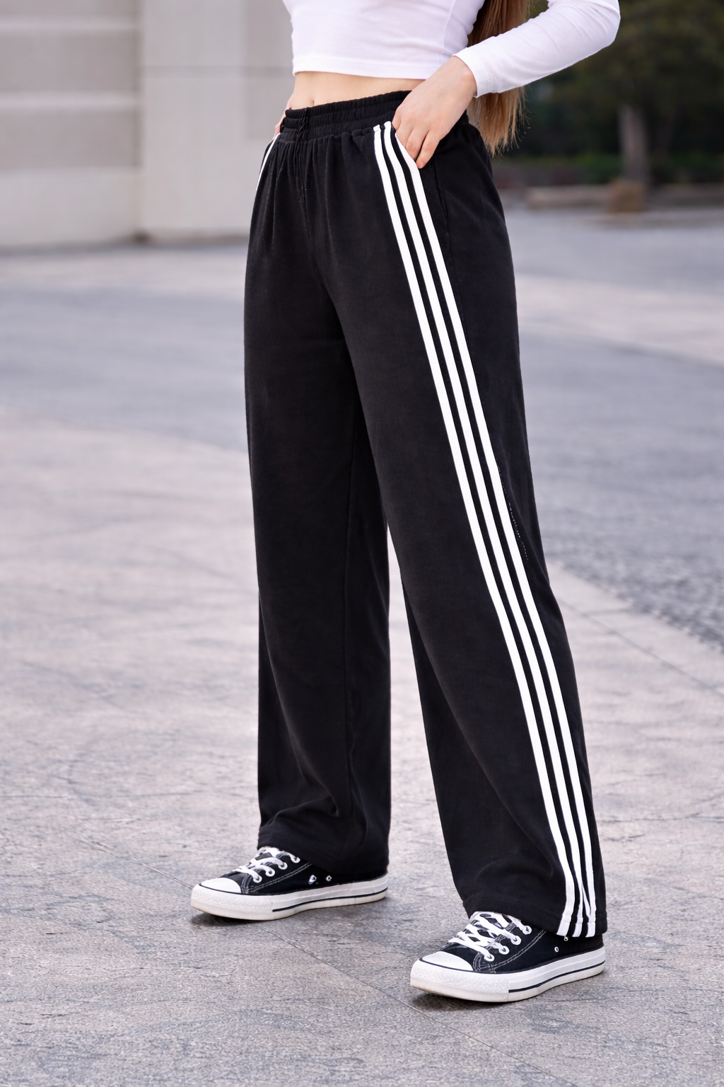 The Stride Wide-Leg Sweatpants are designed for comfort, movement, and everyday street style. Featuring a relaxed wide-leg silhouette, these pants offer a modern fit that drapes naturally while maintaining a clean, structured look. Crafted from soft, durable fabric, they feature a comfortable elastic waistband and a signature triple-stripe detail running down the sides for a bold yet minimal finish. The wide leg cut provides effortless flow and versatility, making them easy to style for both casual and elevated looks. Perfect for daily wear, lounging, or city styling, these sweatpants balance function and fashion without compromise.