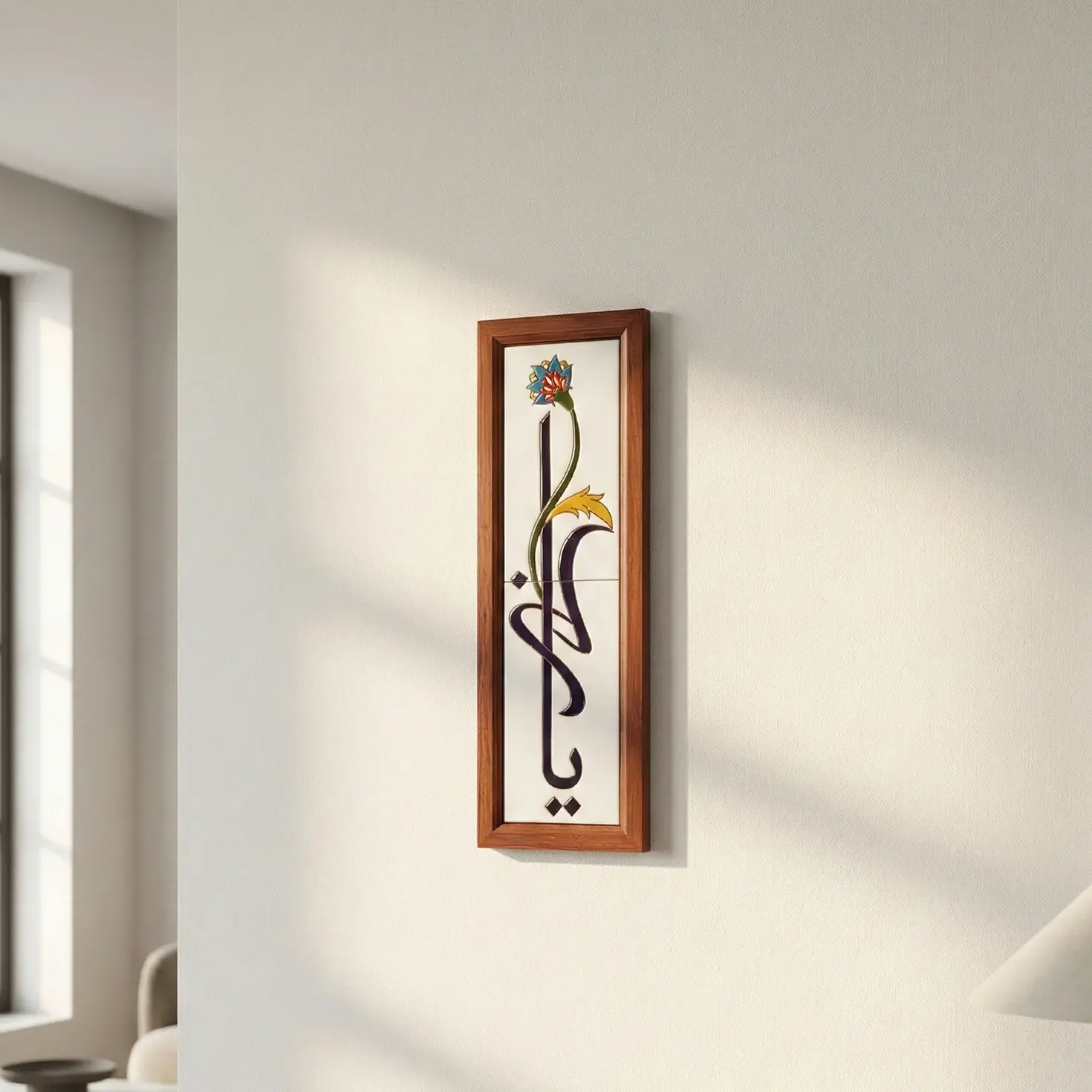 A serene vertical ceramic artwork featuring the heartfelt Arabic invocation “يا رب”, symbolizing humility, hope, and direct supplication. The flowing calligraphy is elegantly intertwined with a subtle floral accent, creating a calm and spiritual visual rhythm. Encased in a warm natural wood frame, this piece brings quiet devotion and timeless beauty to any space.