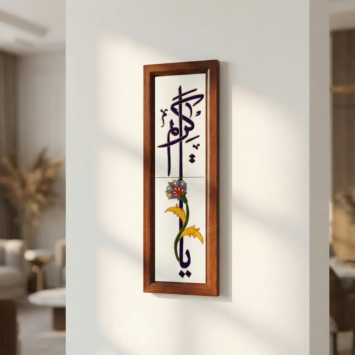 A graceful vertical ceramic artwork featuring the Arabic calligraphy “يا كريم”, invoking generosity and divine benevolence. The flowing script is enriched with a delicate floral motif, creating a harmonious blend of spiritual meaning and decorative elegance. Framed in warm natural wood, this piece adds a sense of serenity and refinement to any interior setting.