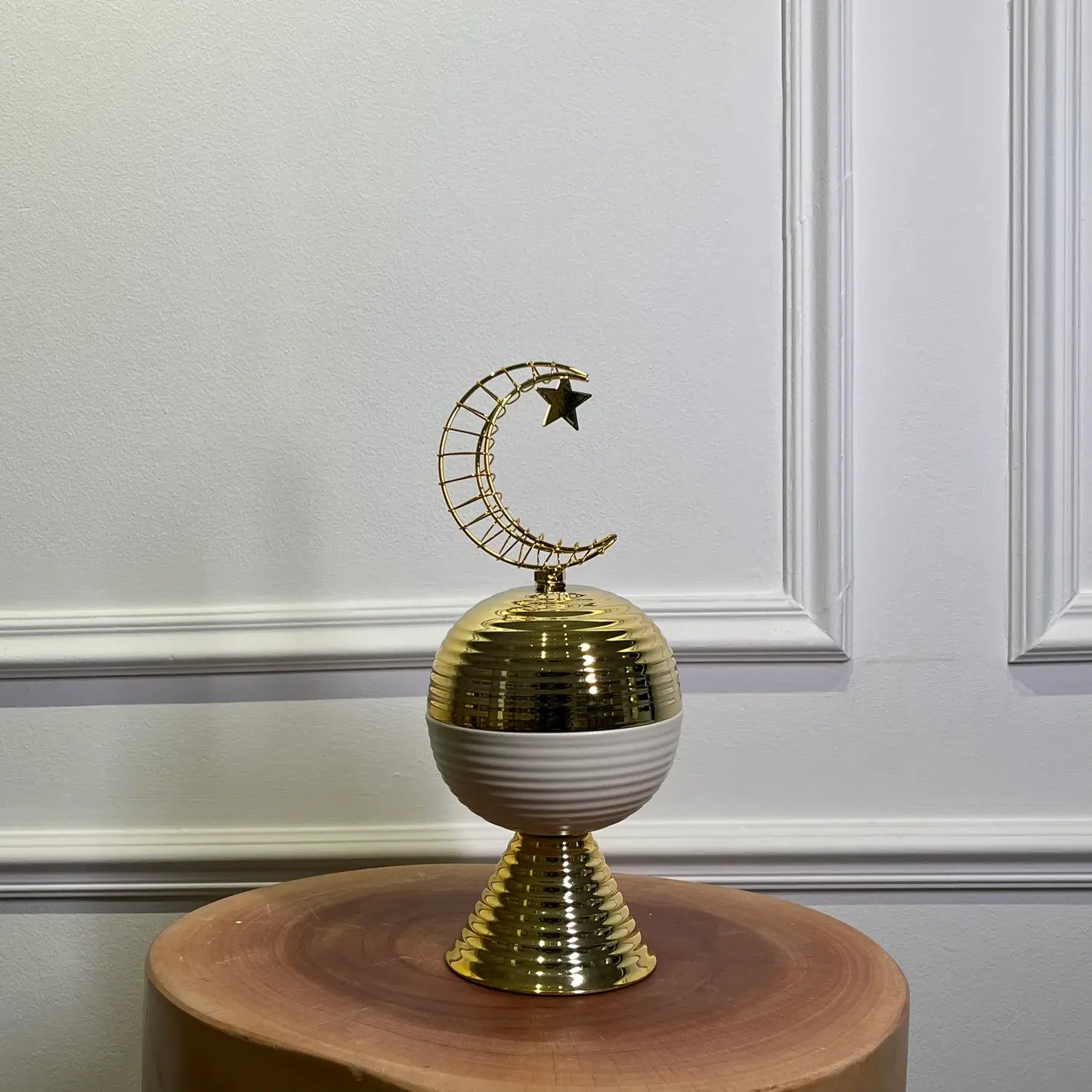 A refined decorative piece featuring a sculptural crescent moon crowned with a star, set atop a ribbed, reflective base. The polished gold finish gives it a luxurious presence, making it a subtle yet striking accent for Ramadan and Islamic-inspired interiors. Ideal for consoles, side tables, or festive seasonal styling.