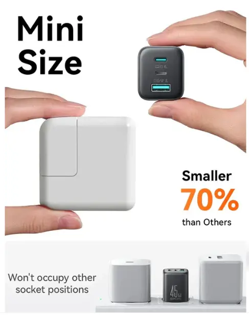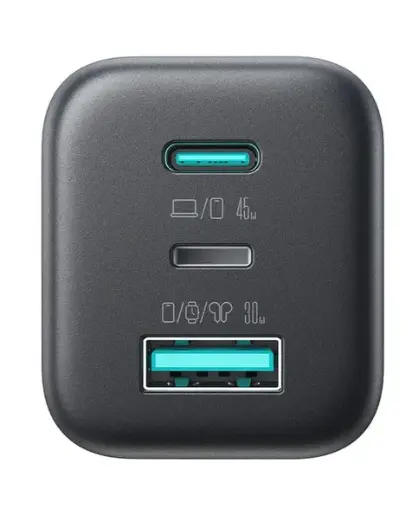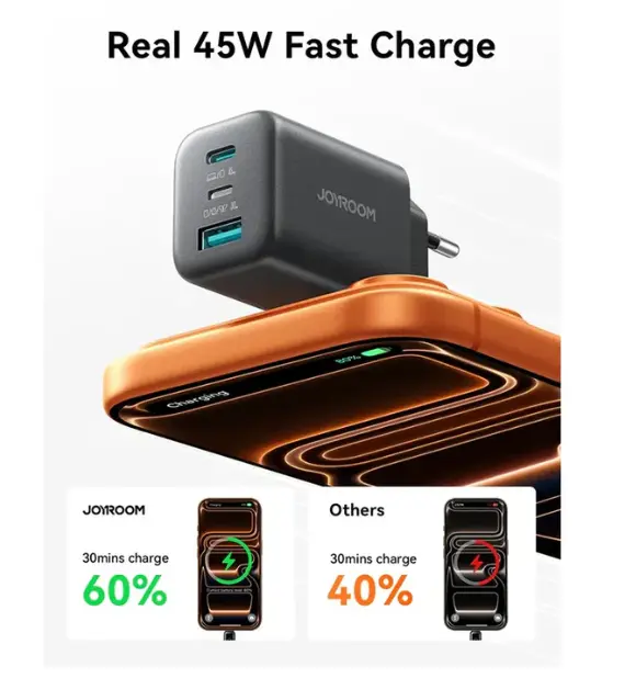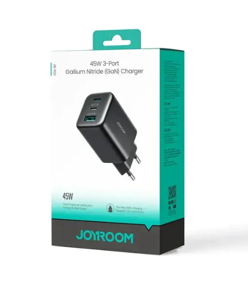 Charge multiple devices quickly and easily with the Joyroom JR-TO1 – a compact 3-port USB-C/USB-A GaN charger with a powerful 45W output.