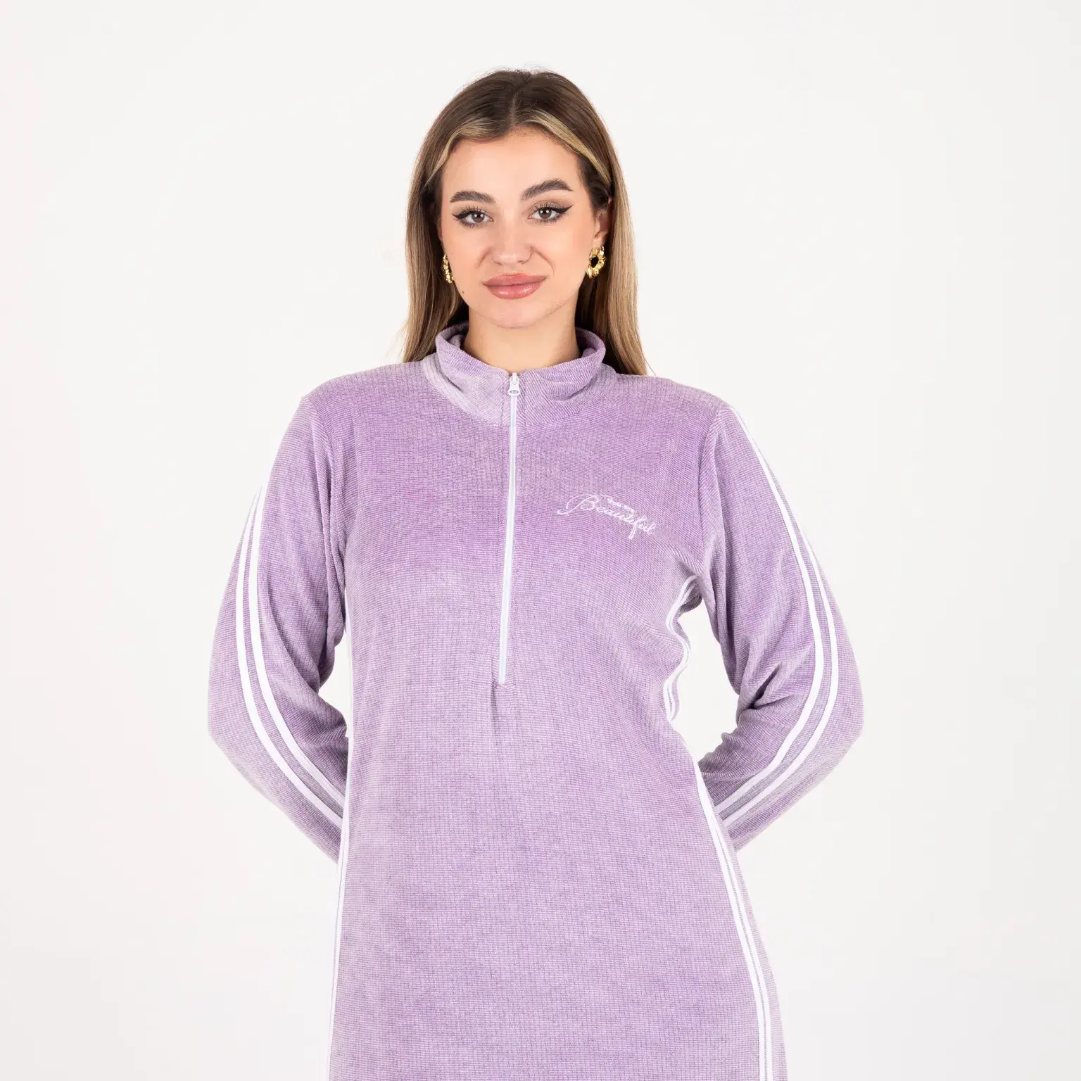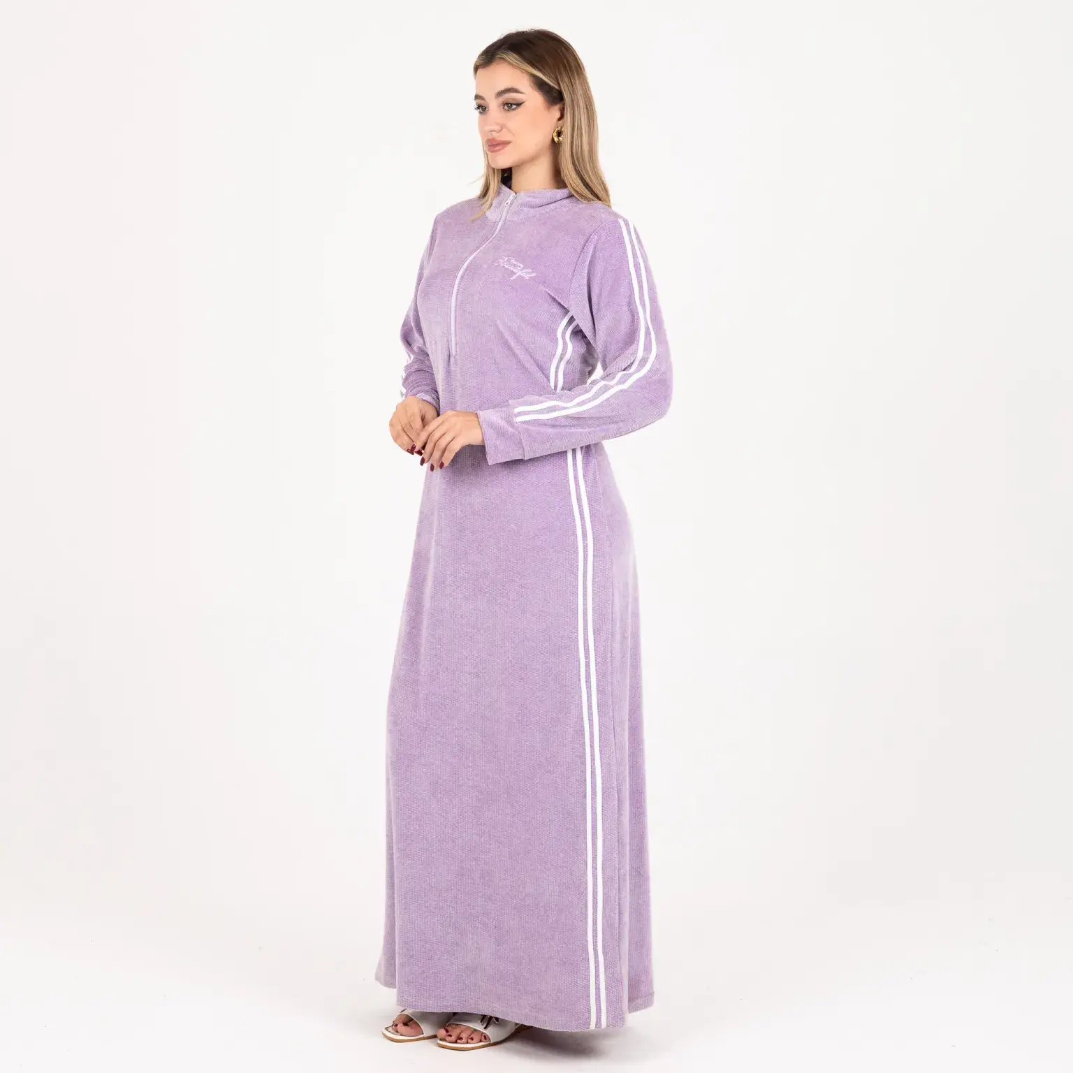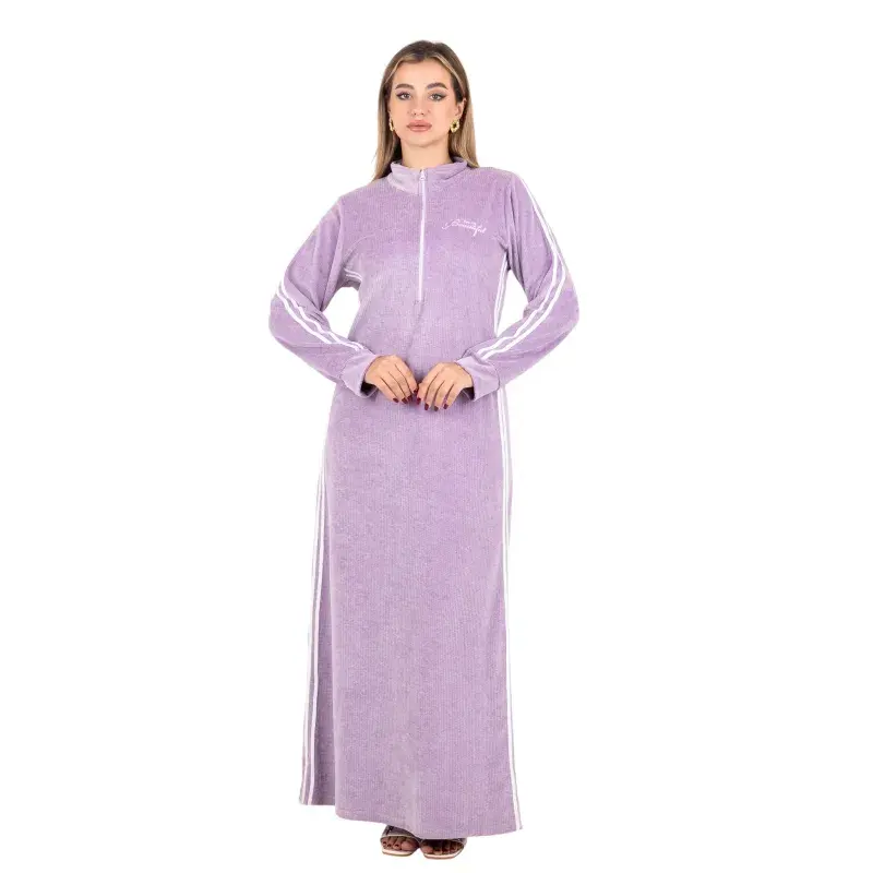 Long Velvet Abaya | Full Sleeves | Double White Side Lines – Elegant Sport Look
