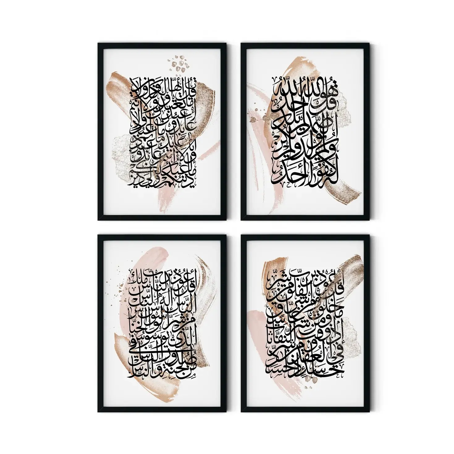 This sophisticated wall art collection blends traditional Arabic calligraphy with soft, modern abstract brush strokes. Each piece features beautifully detailed black calligraphy layered over warm neutral tones, creating a harmonious balance between classic art and contemporary décor.