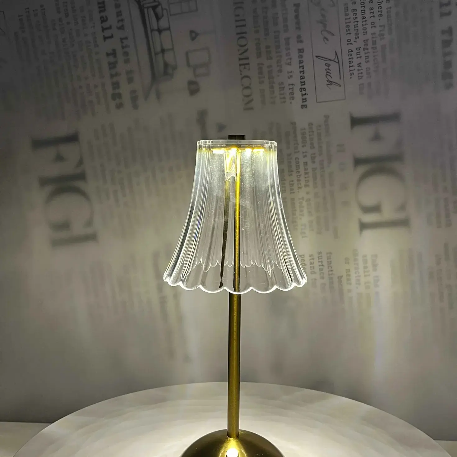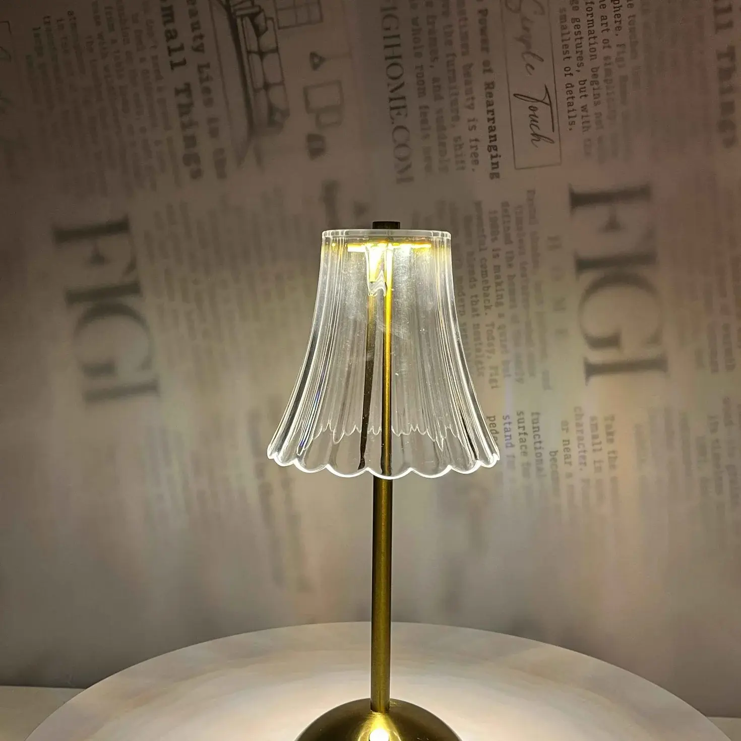 The FLORE Glass Lamp (30 cm) embodies elegance and delicacy with its fluted clear-glass shade that blooms like a flower. Its transparent design allows the light to dance through the curved ridges, casting beautiful reflections around the space. Supported by a slim brushed brass stem and base, it brings a refined touch of modern luxury to any setting.