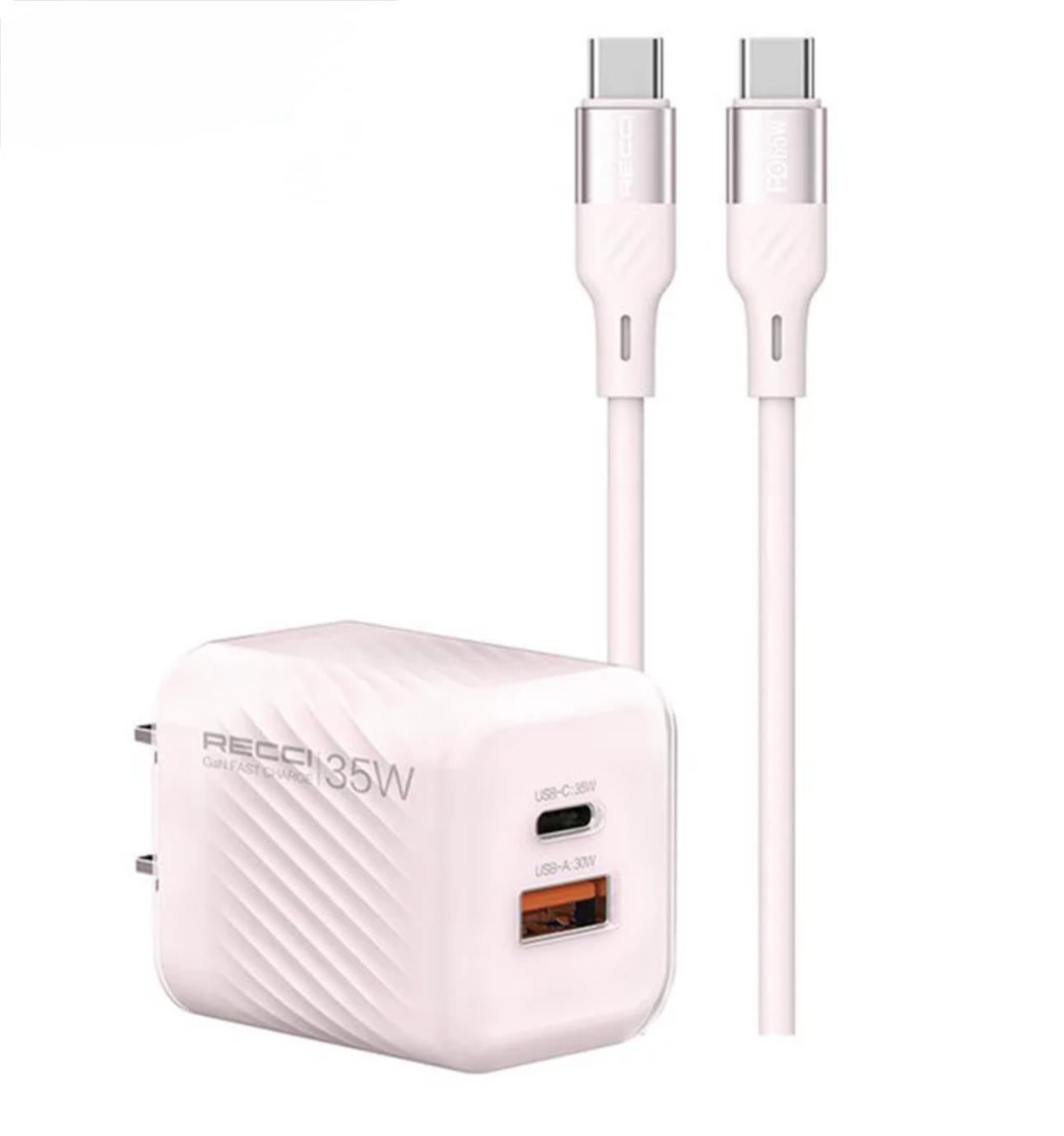 The Recci - RC83CC 35W GAN fast charger is a dual-port charger with PD35W and CCC Certification. Featuring a 1.5M center gauge straight pin and input of 100-240V, it offers fast and efficient charging. With USB-C and USB-A outputs, as well as PPS technology, this charger provides a range of power options. Its aluminum alloy and silicone wire body, along with its Radium carving of the RECCI logo, make it both durable and stylish.