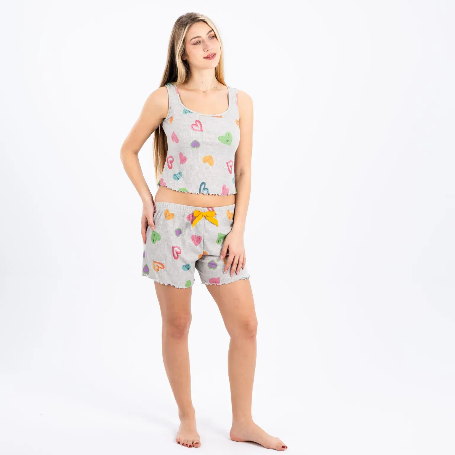 Stay comfy and stylish with this summer pajama set, featuring a sleeveless tank top and matching shorts made from soft, lightweight cotton. Designed with a playful multicolor heart print and finished with a cute yellow waist bow, it’s perfect for relaxed summer days and cozy nights.