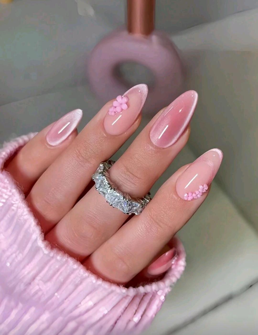 10pcs French Style Pink Cat Eye & Small Flower Design Artificial Nails With Rhinestones, Almond Shaped + 1pc Jelly Glue + 1pc Nail File Press On Nails Nail Supplies