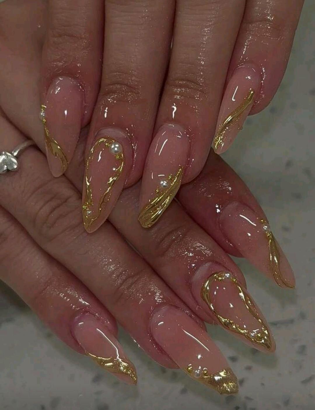 10 pcs Handmade press on nails Long Almond-Shaped Gold 3D Gel Nail Stickers, Pearl Decor Design, French Manicure Style, Perfect Fit Nail Shape, Upgrade Your Fashion. Set Includes: 1pc Jelly Gel And 1pc Nail File. Gold Nails Make Your Fingertips Shine Brilliantly, Suitable For Parties, Dancing And Daily Wear.