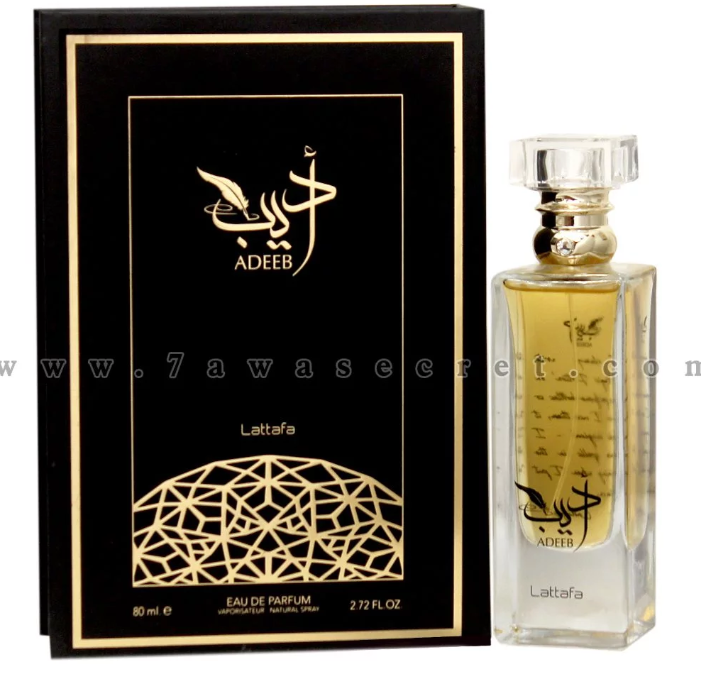 Adeeb Lattafa Perfumes عطر خشبي للجنسين. Adeeb صدر عام 2020. إفتتاحية العطر التبغ, القرفة و الفانيليا; قلب العطر الدخان, التوابل, الزعتر, العود, النوتات العشبية و القرنفل; قاعدة العطر تتكون من الباتشولي, المسك, خشب الأرز, خشب الصندل و العنبر الأسود.