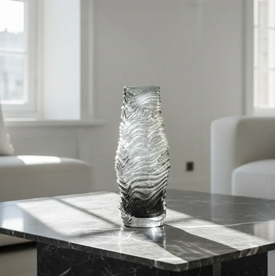 The Onyx Wave Vase is a sculptural masterpiece that combines artistic movement with modern elegance. Crafted from premium smoky glass, its fluid, wave-like texture creates a dynamic visual rhythm that captures and reflects light beautifully from every angle.