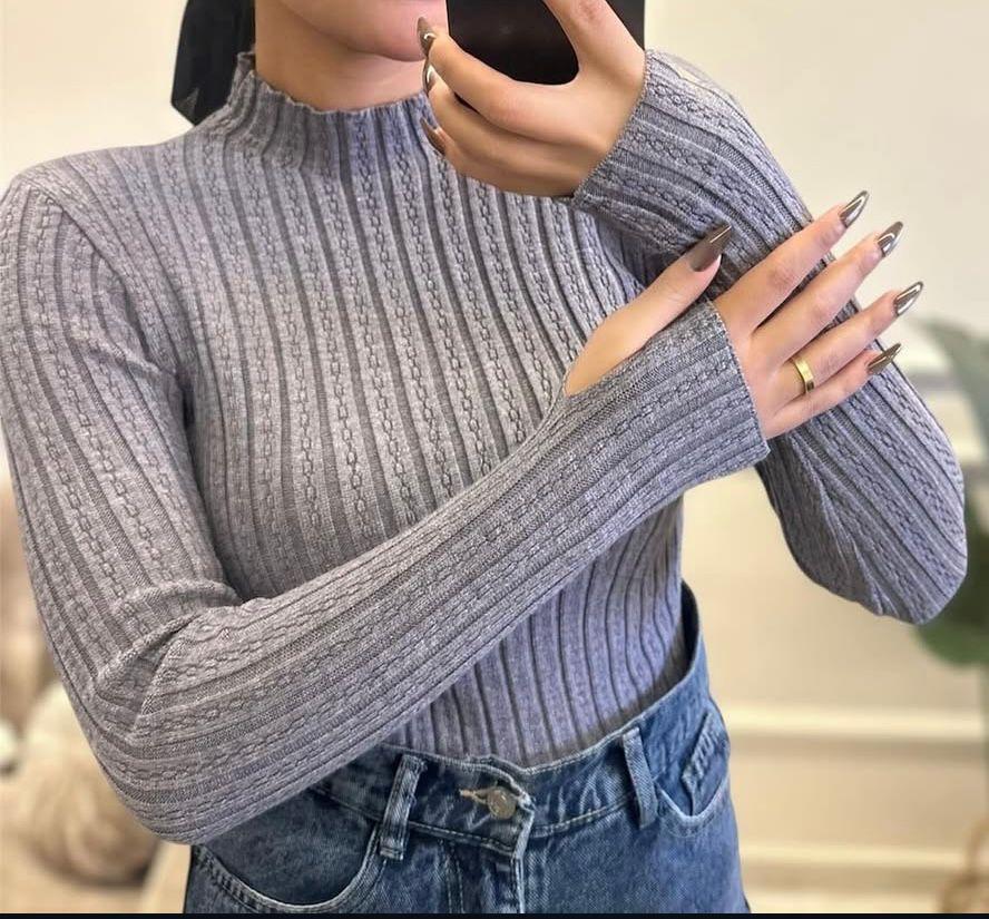 بيزك توب مضلّع بخامة ناعمة ومرنة، قصة سليم فيت مع ياقة عالية، مريح وعملي ومناسب للتنسيق اليومي.