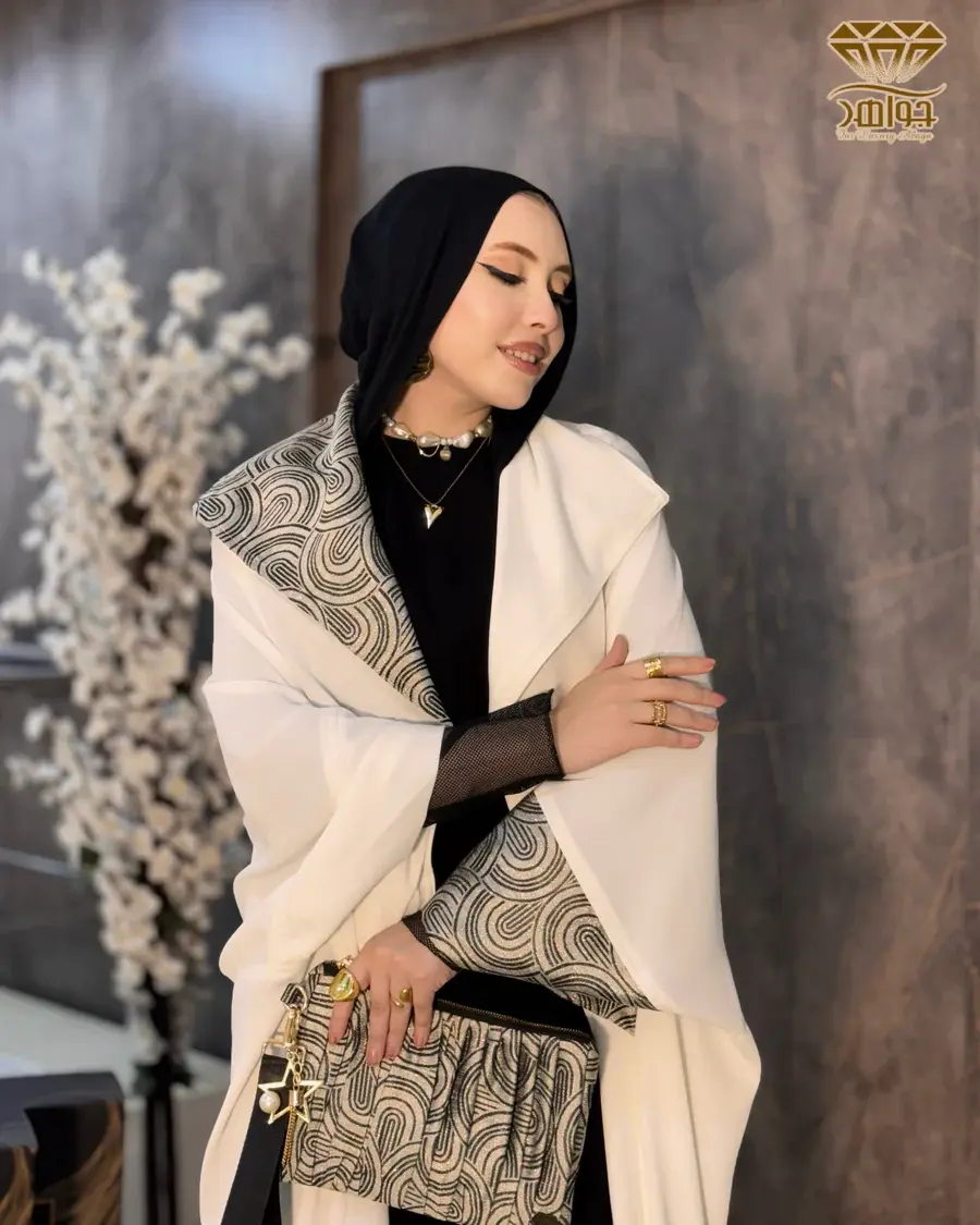 عباية بتصميم مميز بخامة برلين أبيض مستورد بإضافة كم ولياقة بخامة فخمة چاكار مستورد.