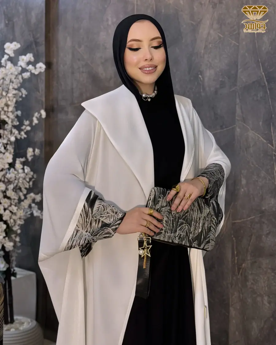 عباية بتصميم مميز بخامة برلين أبيض مستورد بإضافة أكمام بخامة فخمة چاكار مستورد.